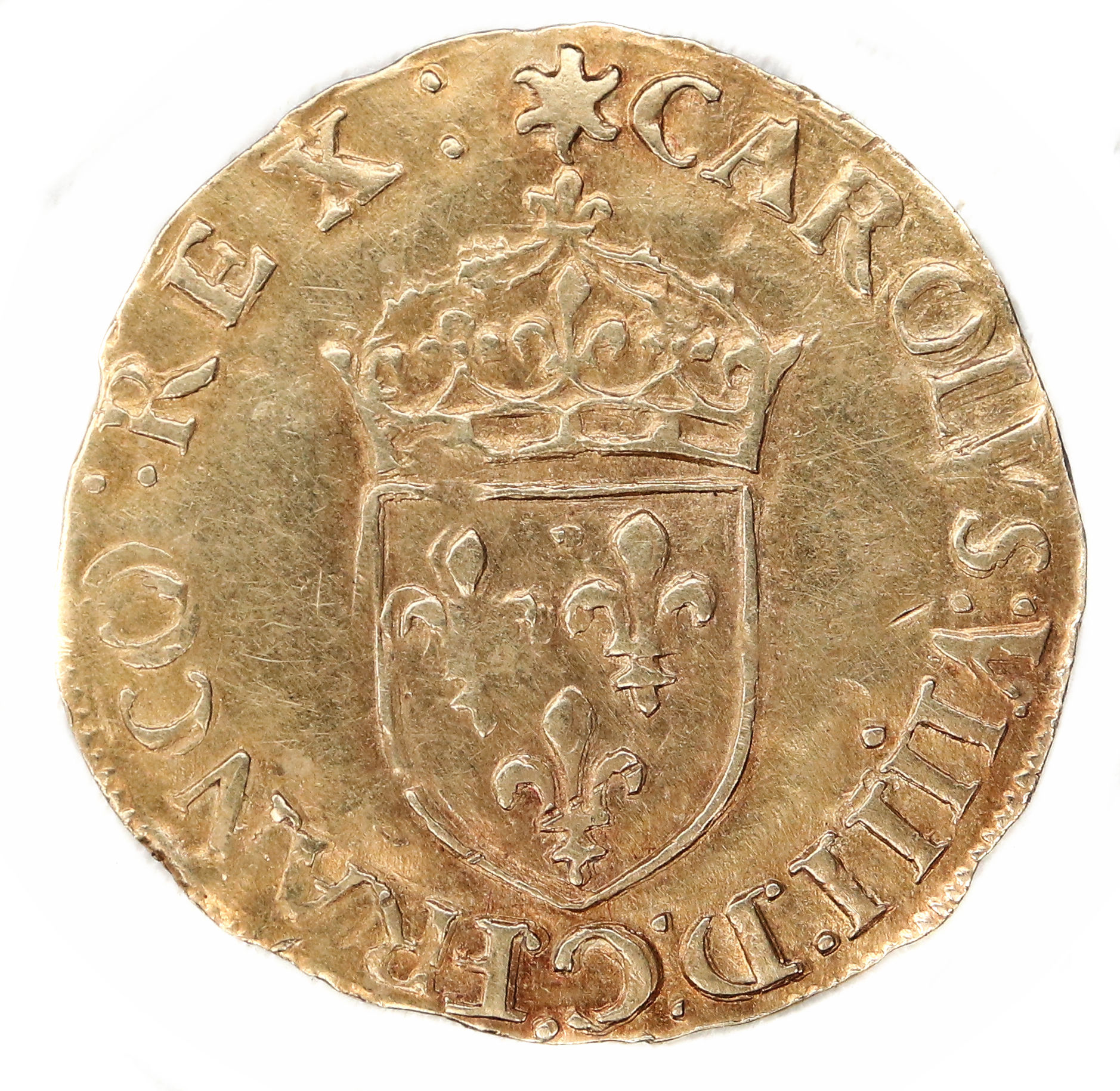 (soleil)CAROLVS:VIIII:D:G:FRANCO.:REX: Charles VIIII par la grâce de Dieu roi des Francs Ecu