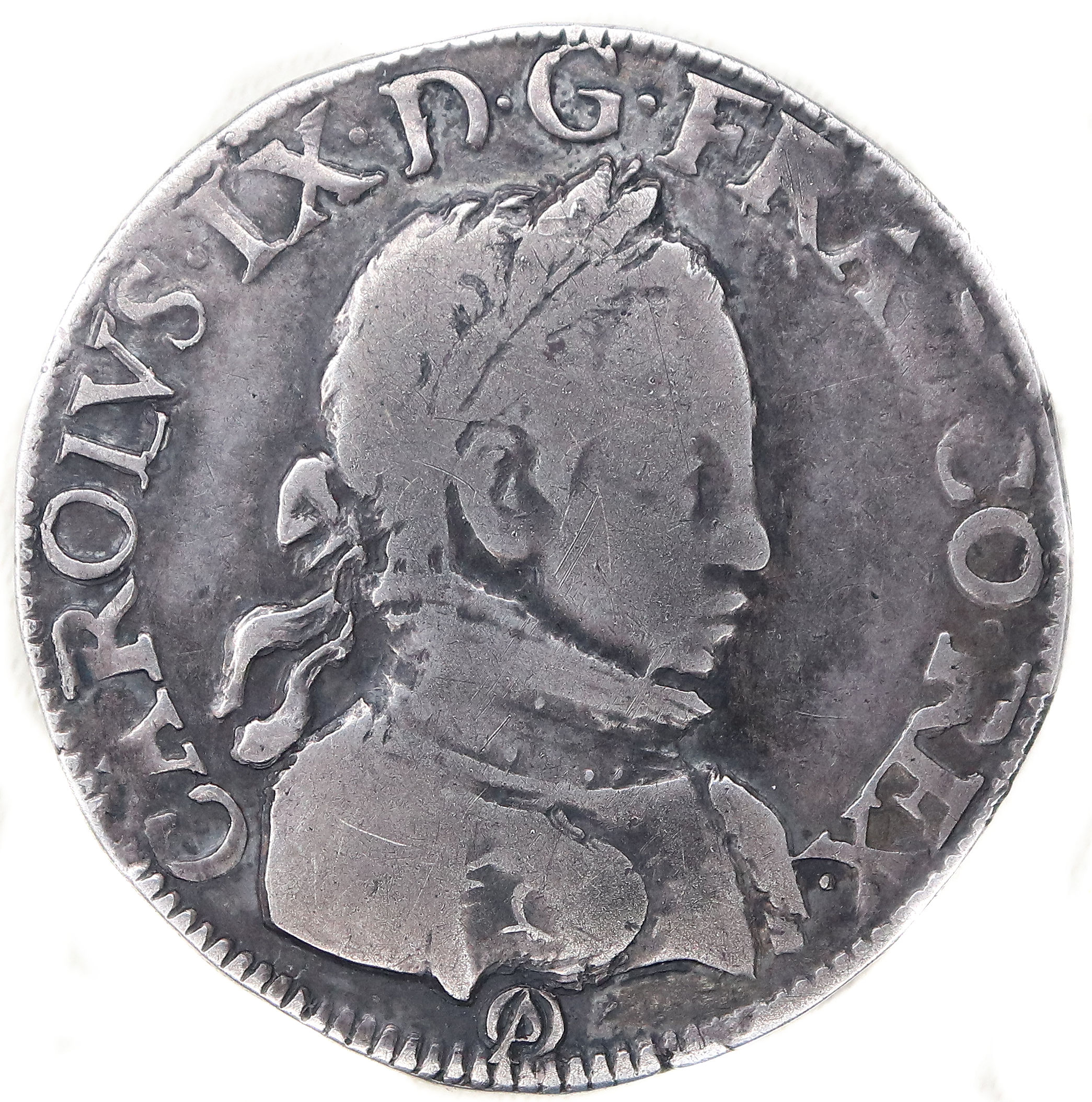 CAROLVS.IX.D.G.FRANCO.REX. Charles IX par la grâce de Dieu roi des Francs Buste du roi, à droite, cuirassé