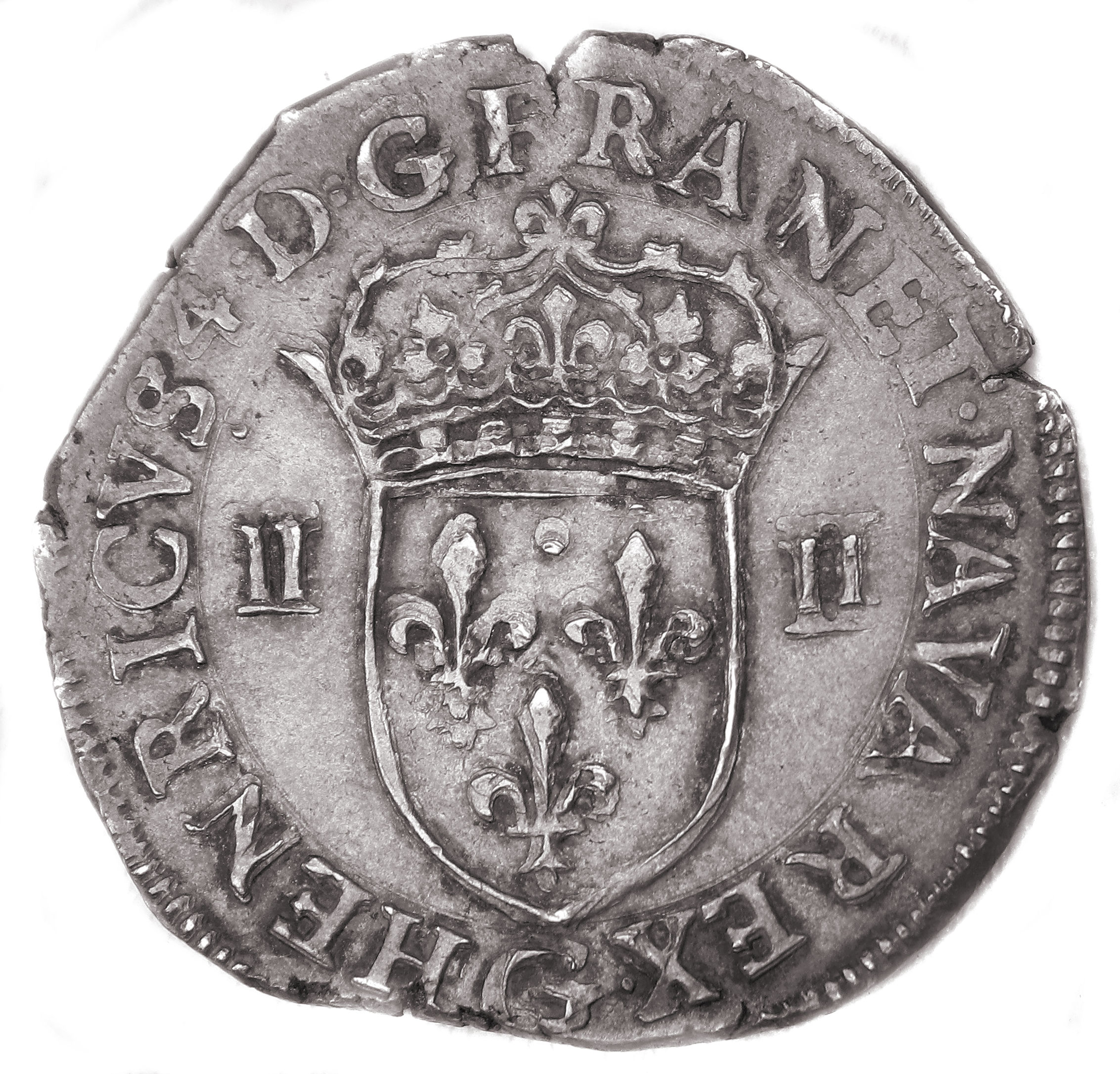 HENRICVS 4.D.G FRAN.ET.NAVA.REX.G Henri IIII par la grâce de Dieu roi de France et de Navarre. Ecu de France couronné acoste de II et II |