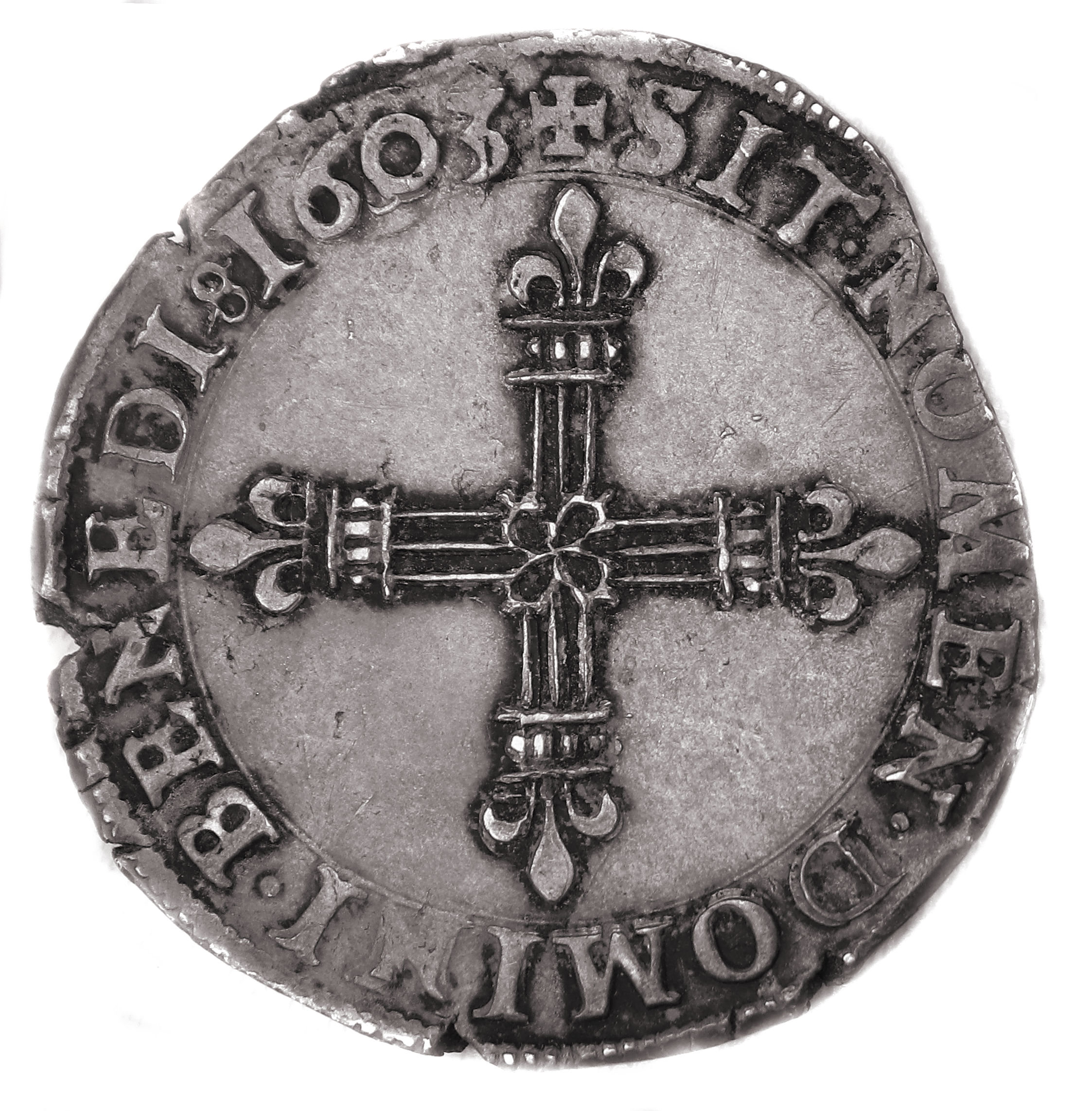 type (écu de face) furent frappés dans quelques ateliers de 1590 à 1607. A Poitiers les monnaies seront frappées suivant 2 types . Commentaire dans Franciae IV : "Dans la série des quarts et huitièmes d'écu de Henri III à Louis XIV, l'un des types présente un écu de France couronné et accosté de II et II ou V-III et une croix fleurdelisée avec un fleur cruciforme en coeur. Dans la grande majorité, la croix se présente au droit et l'écu ou revers mais dans un certain nombre d'atelier, on observe l'inverse : l'écu est au droit et la croix au revers" Pour l'atelier de Poitiers et le millésime 1603, il est noté "existence possible" pour le quart d'écu du 1er type, la même remarque est faite dans l'ouvrage de S. Sombart chez Gadoury en 2022. La monnaie confirme donc cette existence. Elle a fait partie de Monnaies 37 de la maison CGB en 2009 avec le commentaire suivant : "Monnaie de la plus grande rareté dont le type n’est pas signalé dans l’ouvrage de Jean Lafaurie et Pierre Prieur ou dans celui de Jean Duplessy. Monnaie qui manquait à la collection de quarts et huitièmes d’écu de M. Beynier." et la description suivante : "Ce quart d’écu est frappé sur un flan irrégulier et assez large. Exemplaire légèrement tréflé au droit et recouvert d’une légère patine grise" Le flan irrégulier présente quelques échancrures.a monnaie est assez agréable avec la croix du revers quasi superbe . Axe des coins : 3h |