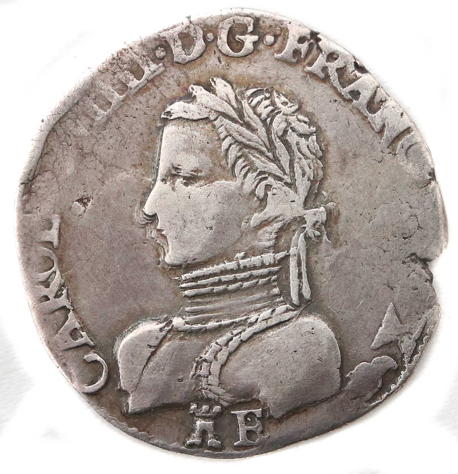 (tour).CAROLVS.VIIII.D.G.FRANC.REX(dif) E (tour) Charles VIIII par la grâce de Dieu roi des Francs Buste du roi, à gauche, cuirassé