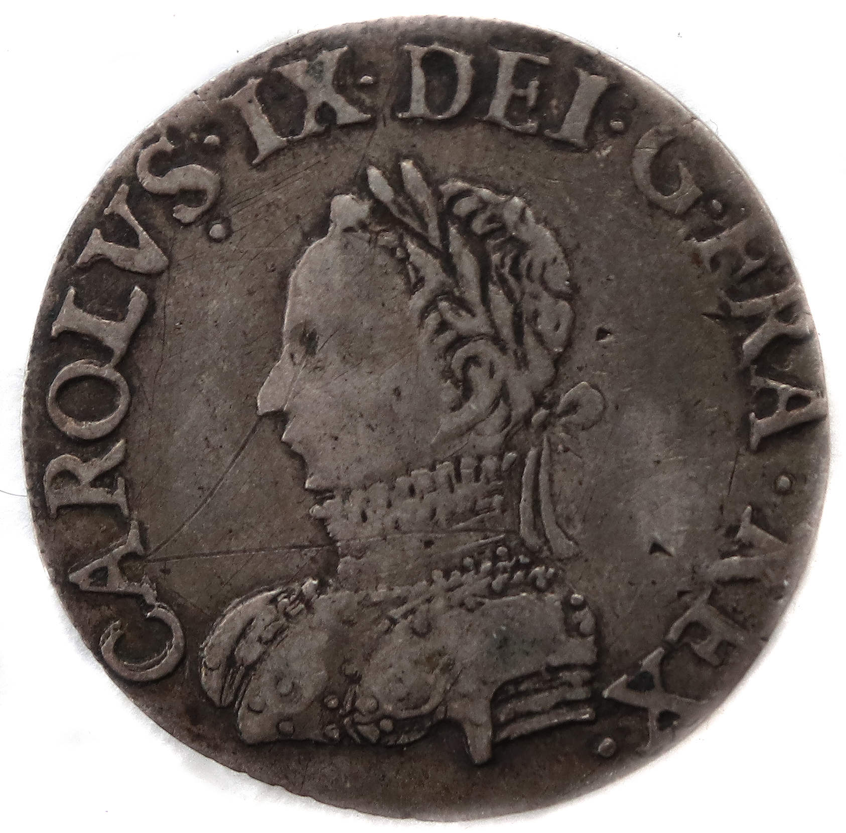 .CAROLVS.IX.DEI.G.FRA.REX. Charles IX par la grâce de Dieu roi des Francs Buste du roi, à gauche, cuirassé
