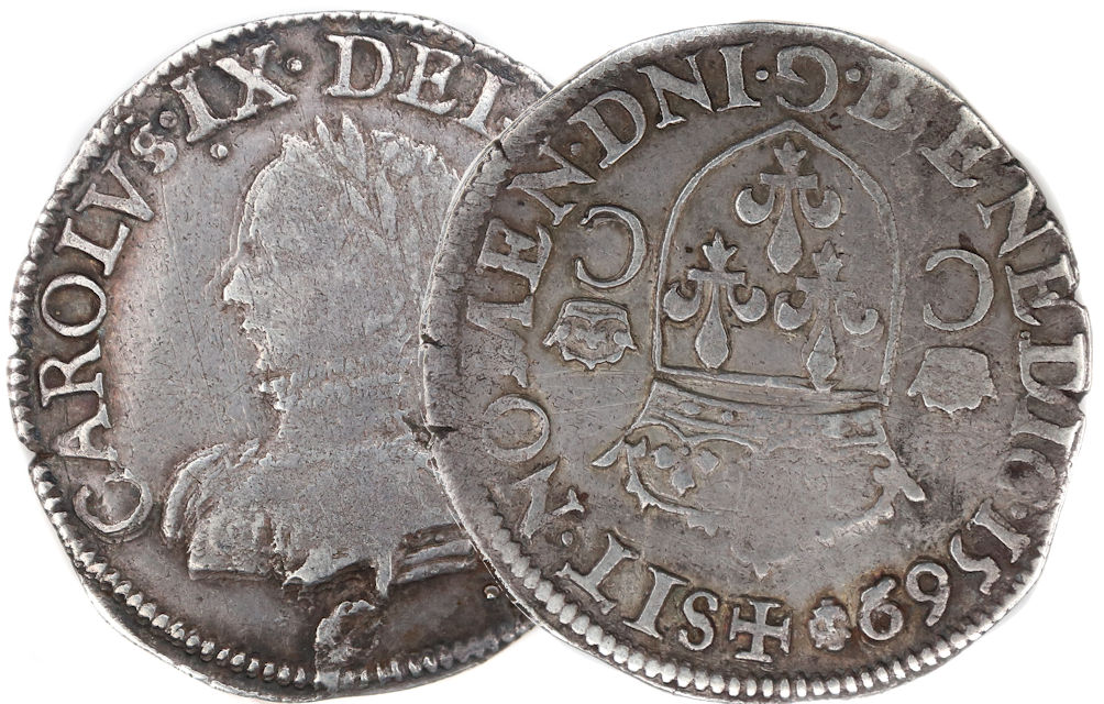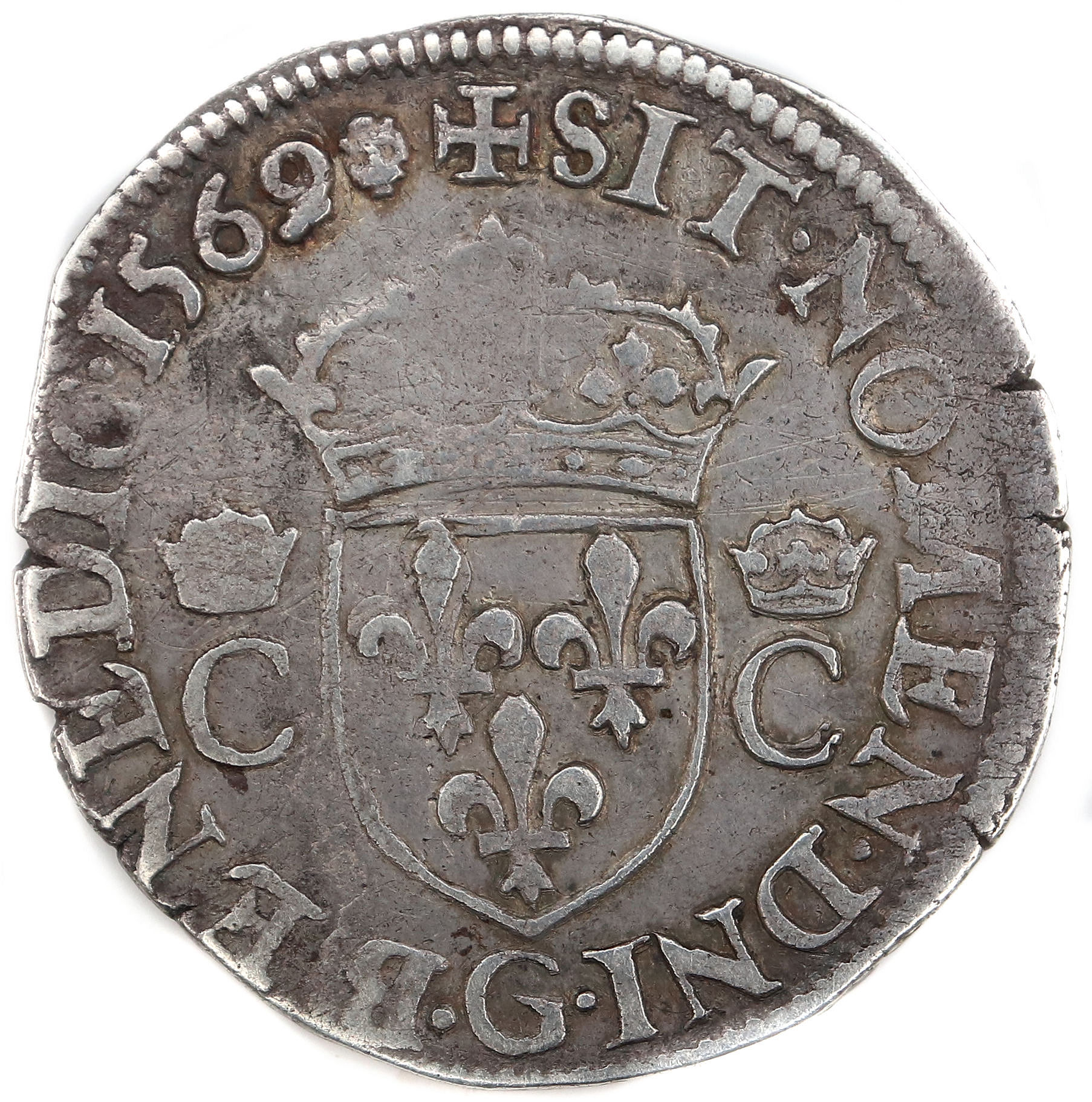 Lettre d'atelier : G (au droit sous l'effigie) Point secret : 8éme (au droit) Millésime : 1569 Chiffre de frappe connu : 4 686 ex. |