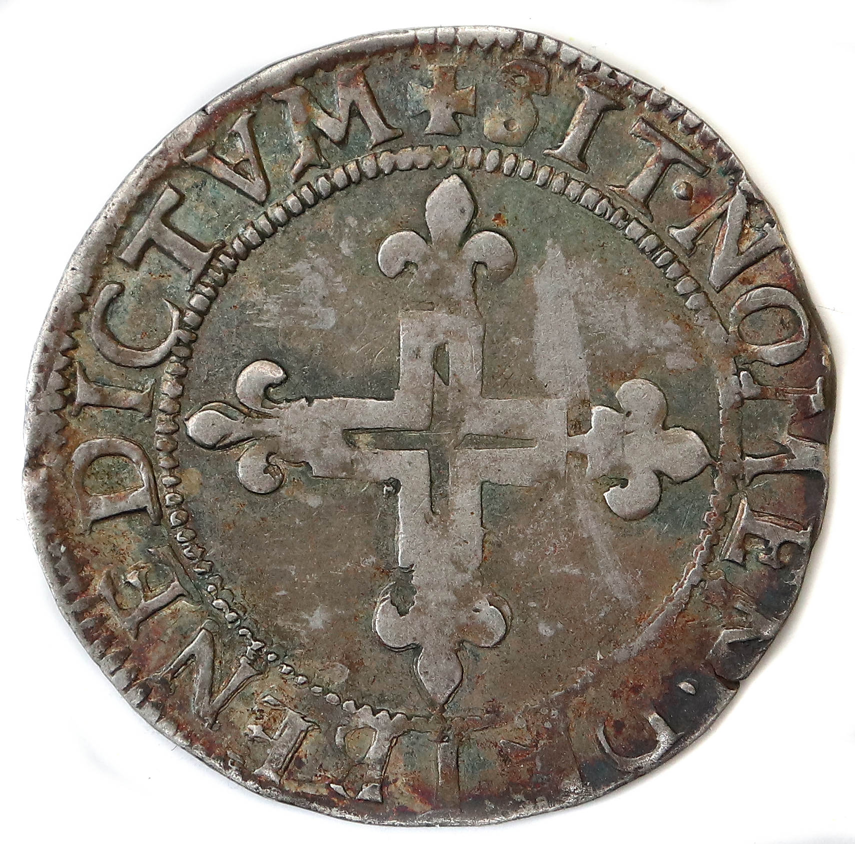 +SIT.NOMEN.DNI.BENEDICTVM. Croix cléchée fleurdelisée |
