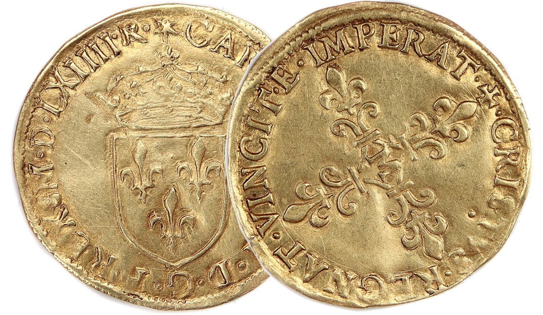 de la croix fleurdelisée) Point secret : 5éme (au revers) Millésime : MDLXIIII Chiffre de frappe connu : 5 000 ex (avec 1/2 Ecus) Indice de rareté : R5 |