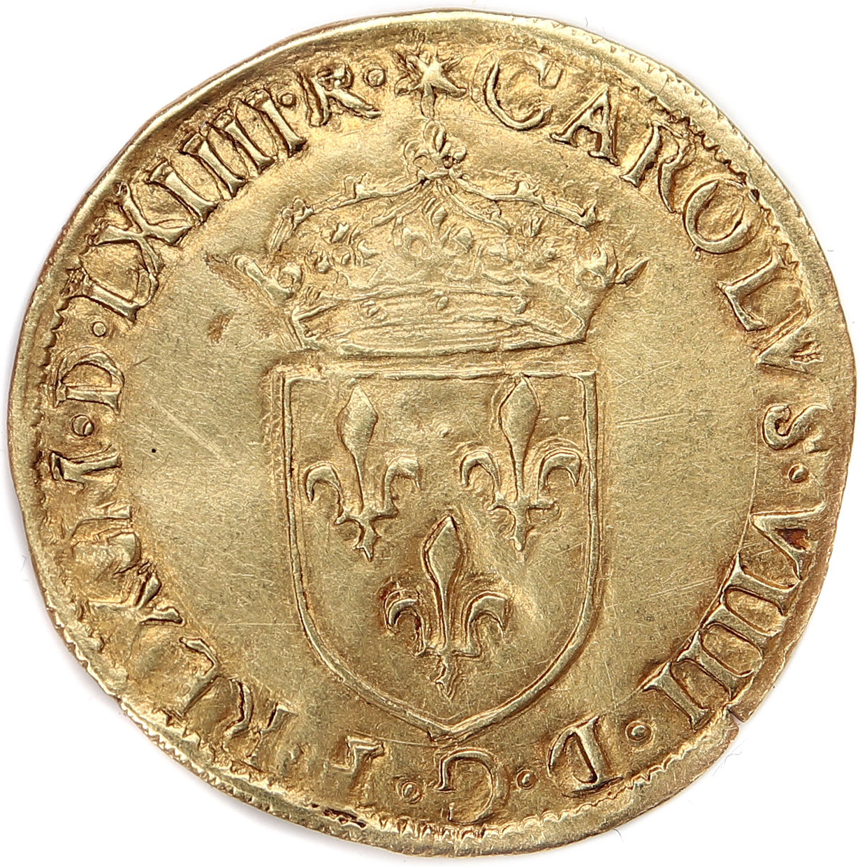 (soleil)CAROLVS.VIIII.D.G.F..REX.(dif)MDLXIIII.R Charles VIIII par la grâce de Dieu roi des Francs Ecu de France couronné