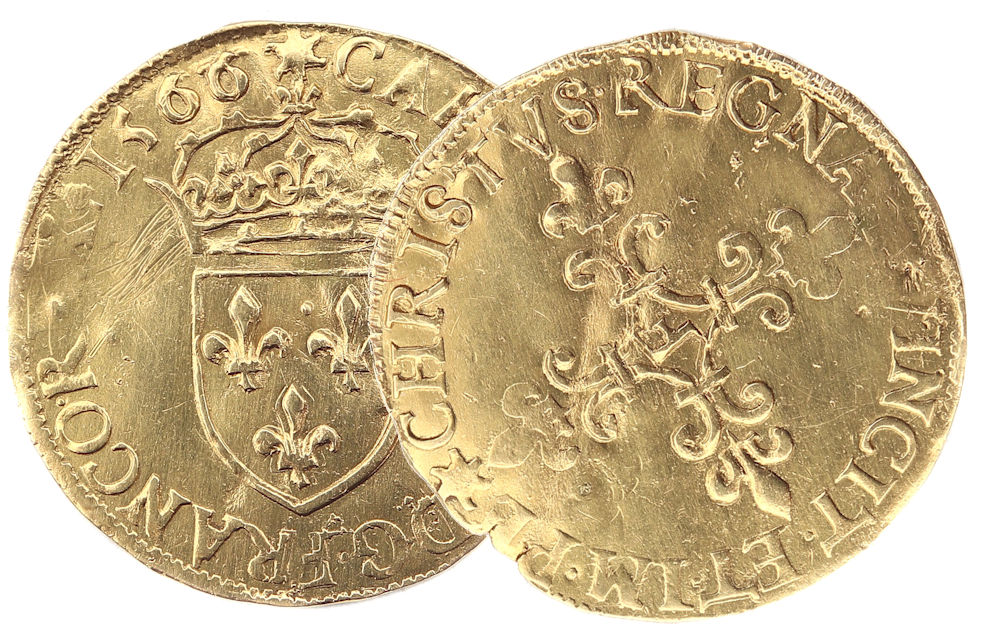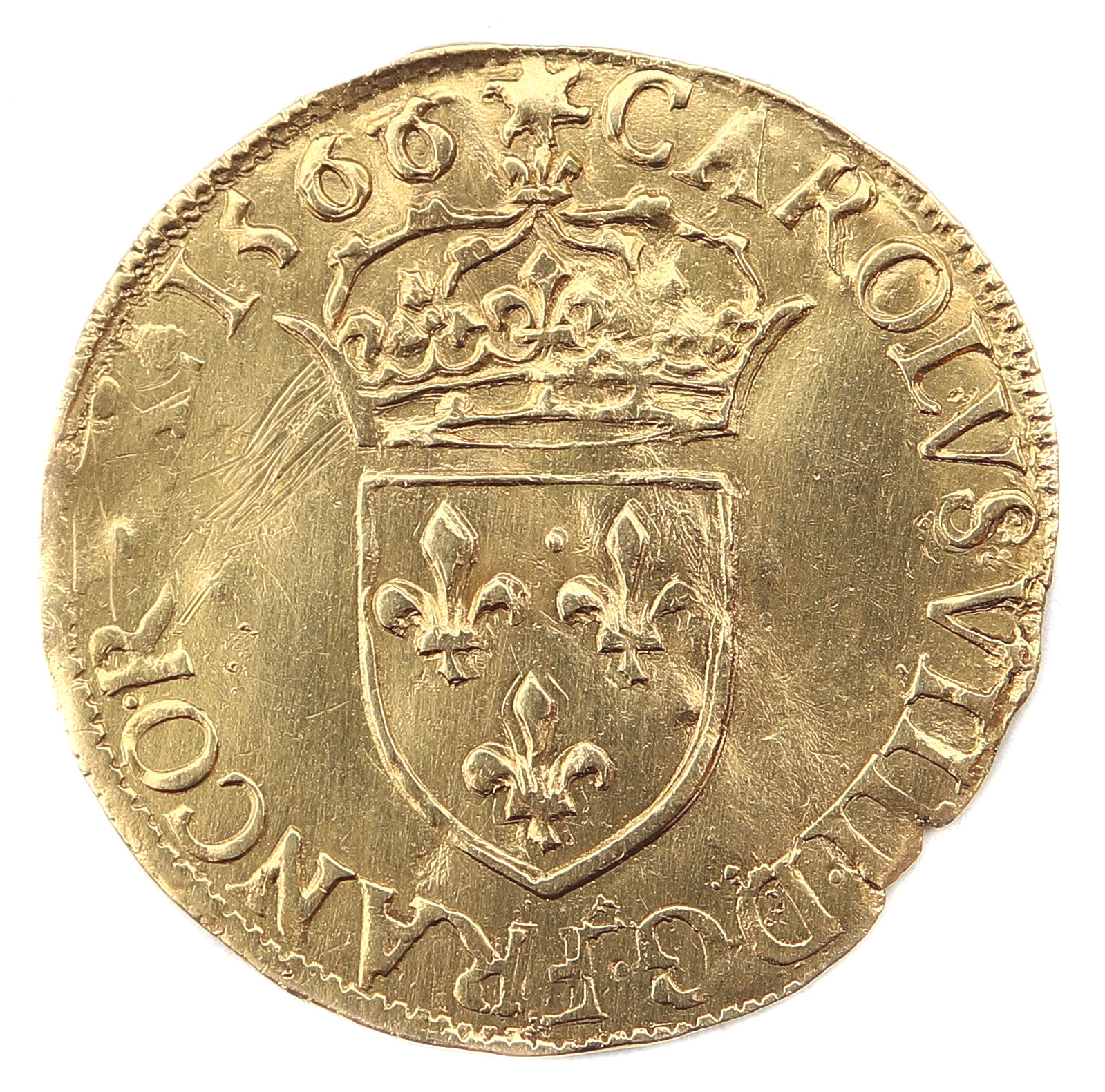 de la croix fleurdelisée) Point secret : NON Millésime : 1566 Chiffre de frappe connu : 21 600 ex (avec 1/2 Ecus) |
