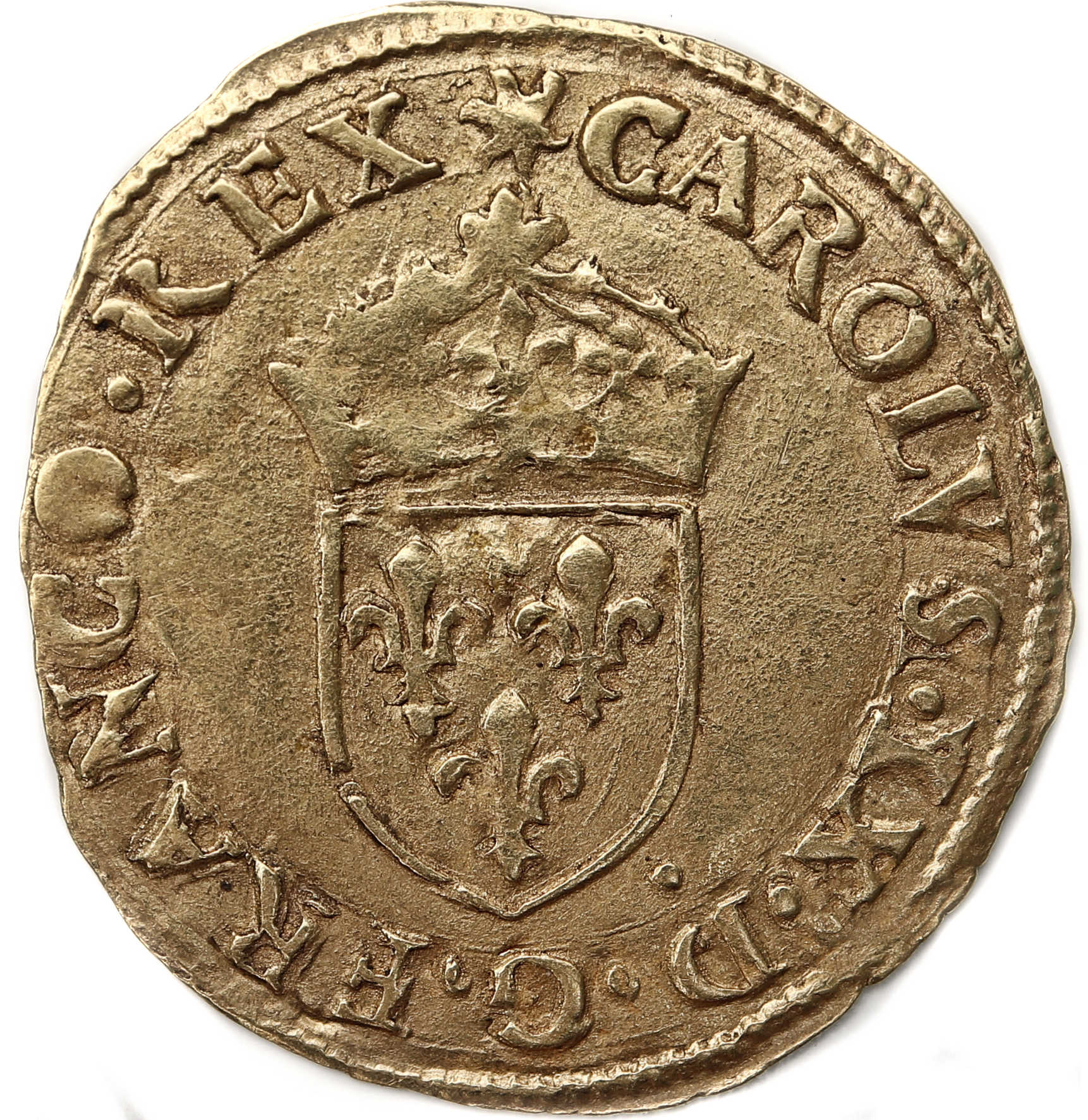 (soleil)CAROLVS.IX.D.G.FRANCO.REX Charles IX par la grâce de Dieu roi des Francs Ecu de France couronné d'un