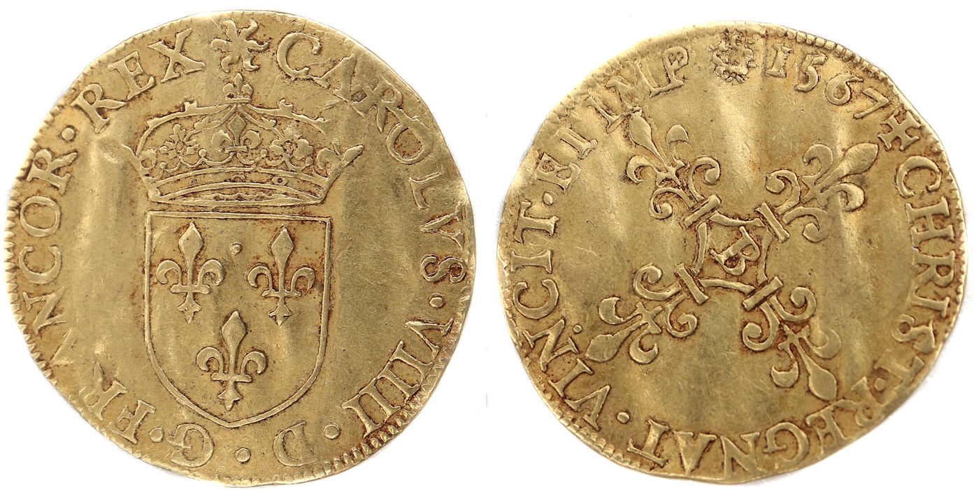 de la croix fleurdelisée) Point secret : 15 éme (au revers) Millésime : MDLXVII Chiffre de frappe connu : 80 300 ex (avec demi ecus d'or) Indice de rareté : C |