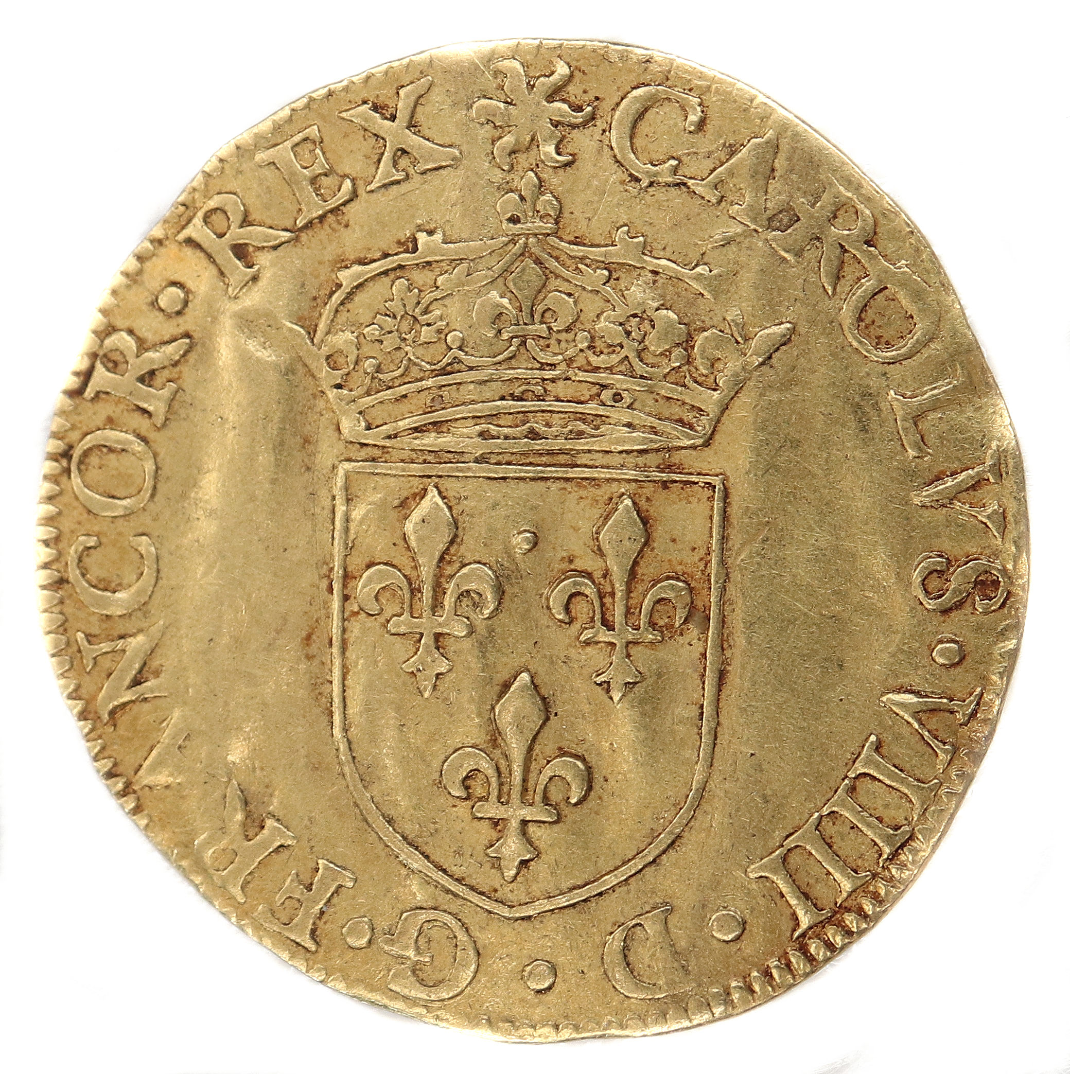 (soleil)CAROLVS.VIIII.D.G.FRANCOR.REX Charles VIIII par la grâce de Dieu roi des Francs Ecu de France couronné d'un