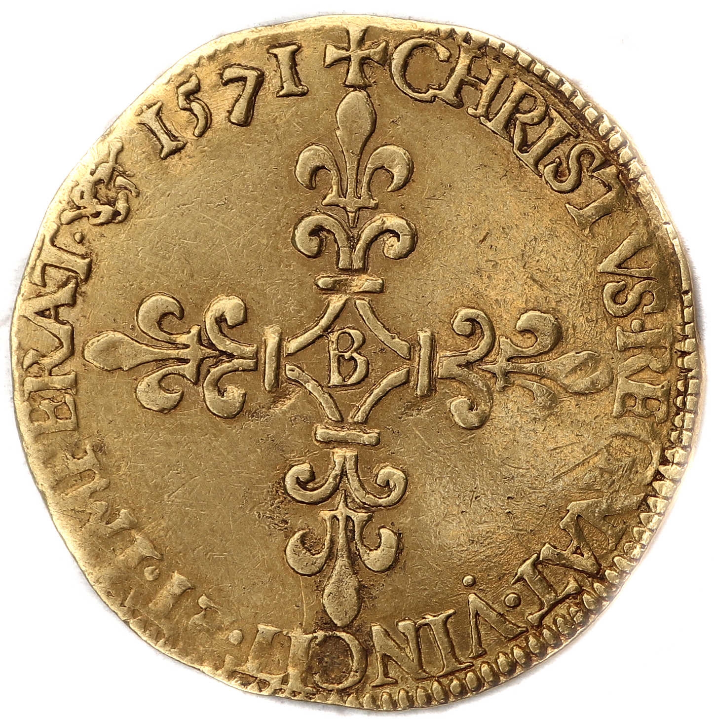 de la croix fleurdelisée) Point secret : 15éme (au revers) Millésime : 1571 Chiffre de frappe connu : 35 100 ex (avec
