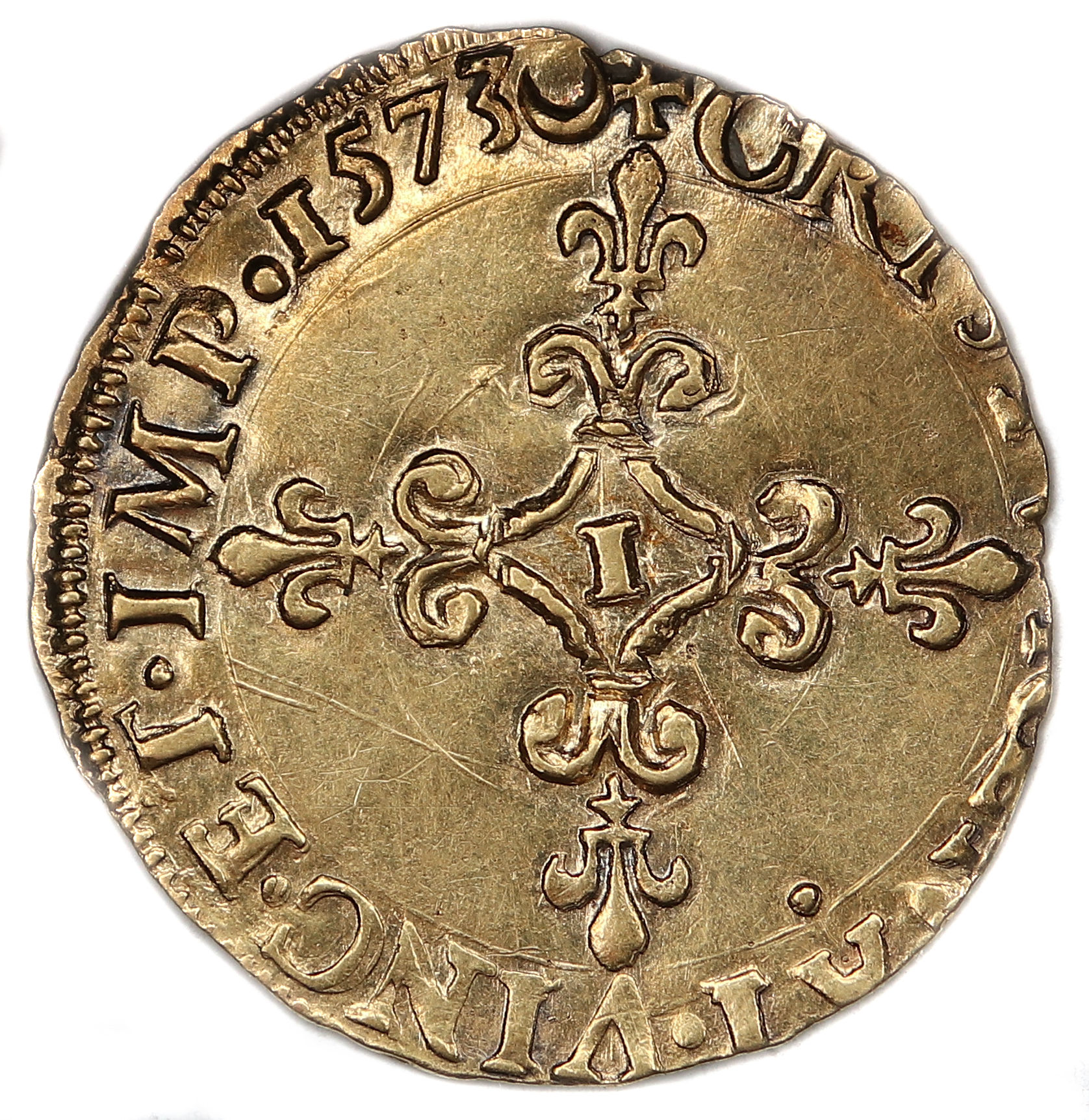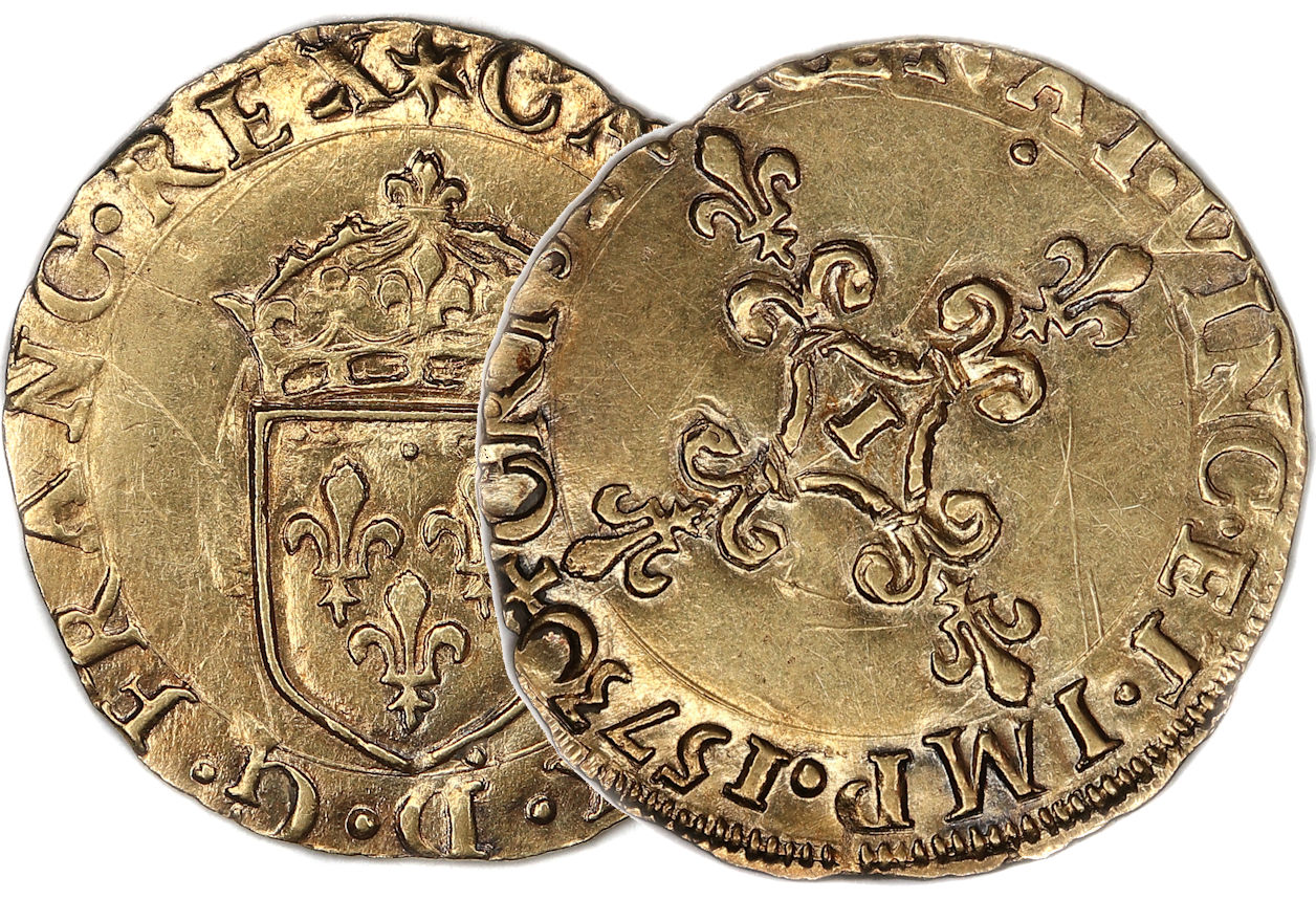 de la croix fleurdelisée) Point secret : 10éme (au droit et au revers) Millésime : 1573 Chiffre de frappe connu : 1 380 ex .(avec demi-ecus d'or) Indice de rareté : R5 |