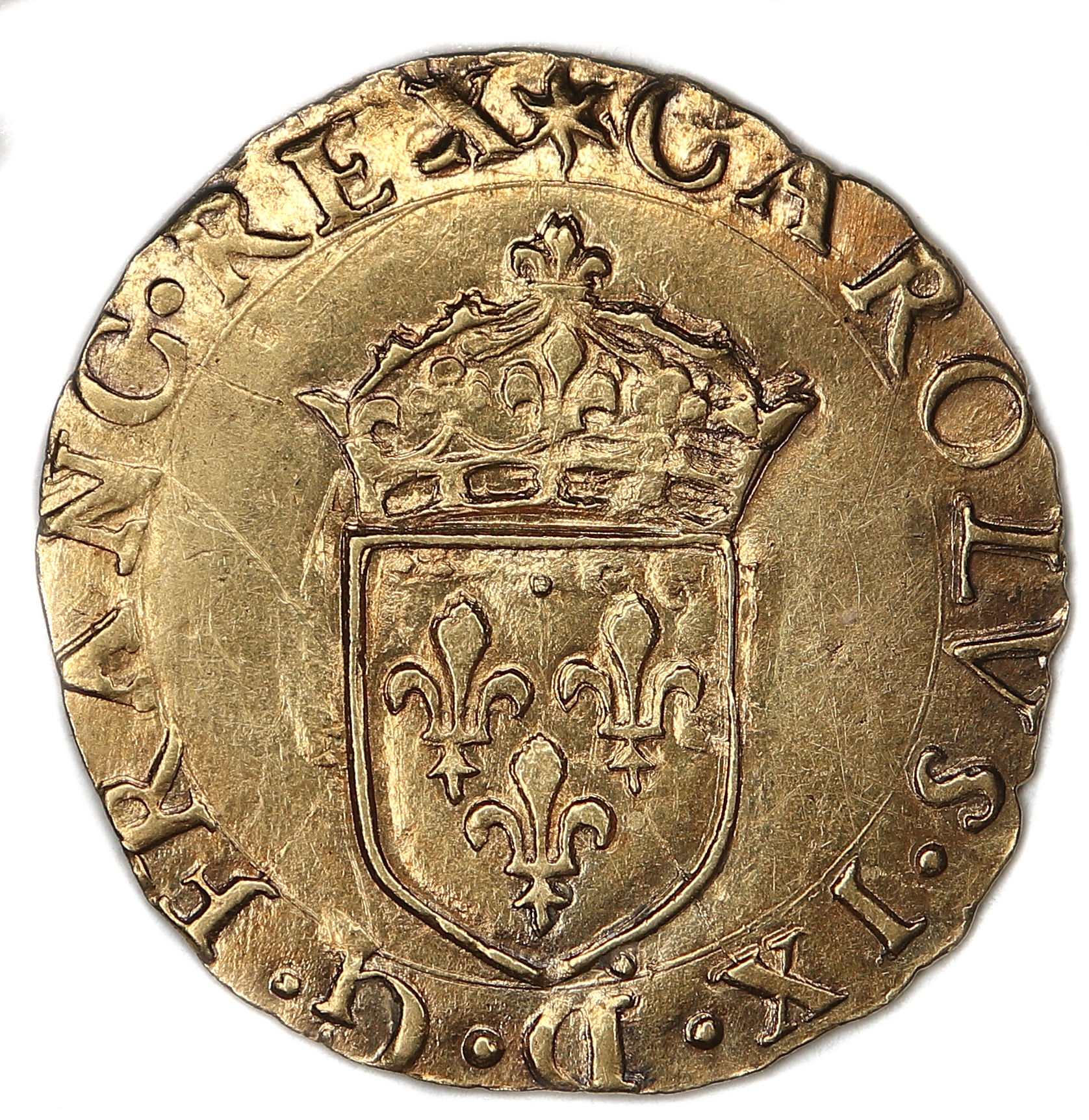 (soleil)CAROLVS.IX.D.G.FRANC.REX Charles IX par la grâce de Dieu roi des Francs Ecu de France couronné d'un
