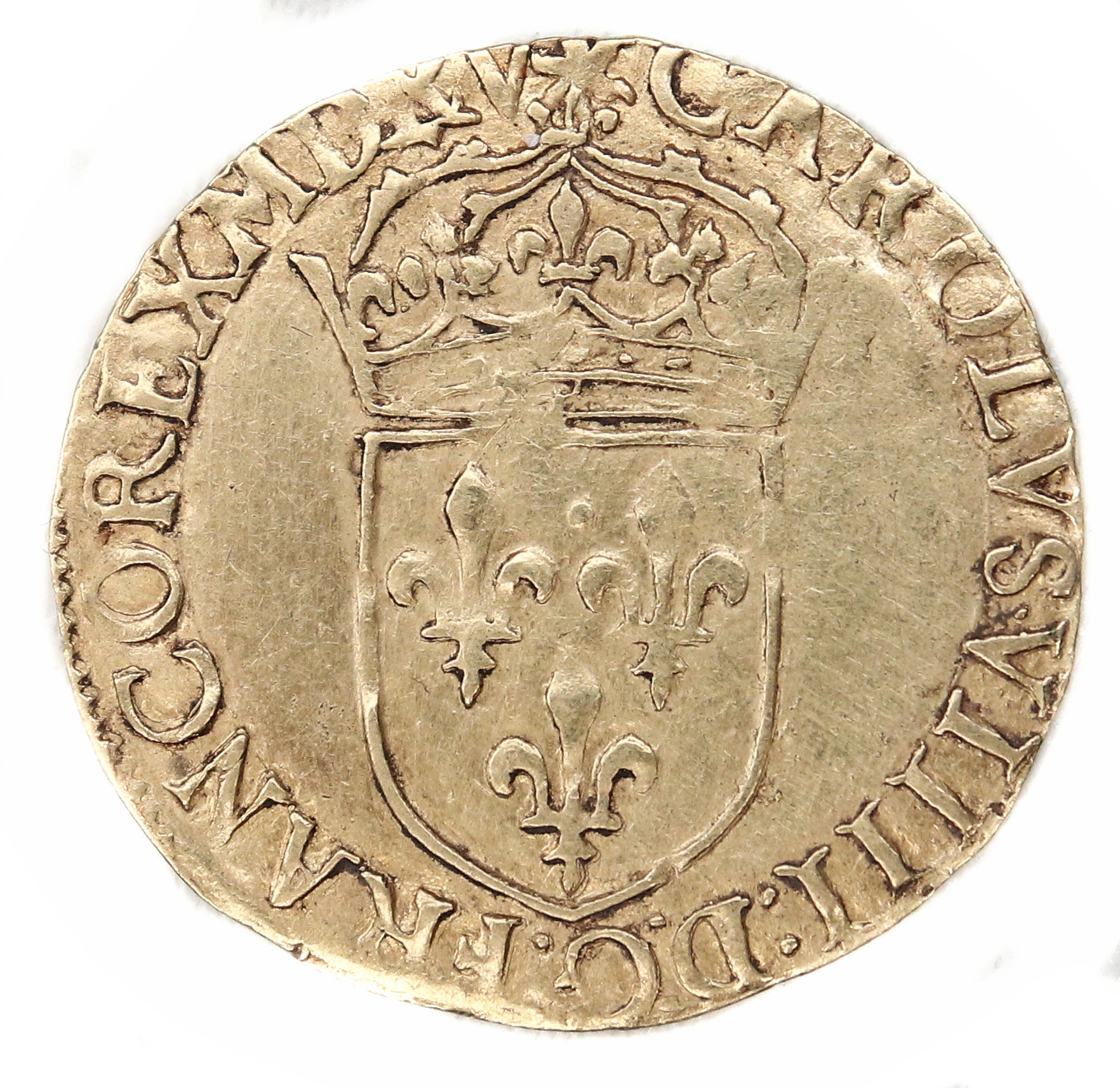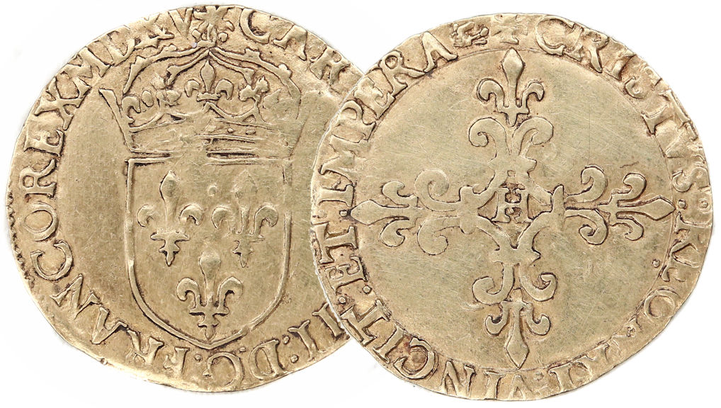 de la croix fleurdelisée) Point secret : OUI (9éme au revers) Millésime : 1565 Chiffre de frappe connu : 15 616 ex (avec 1/2 Ecus) Indice de