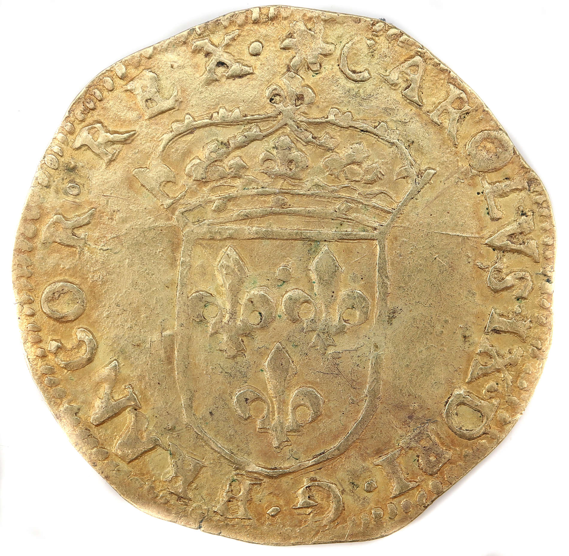 (soleil)CAROLVS.IX.DEI.G.FRANCOR.REX. Charles VIIII par la grâce de Dieu roi des Francs Ecu de France couronné d'un