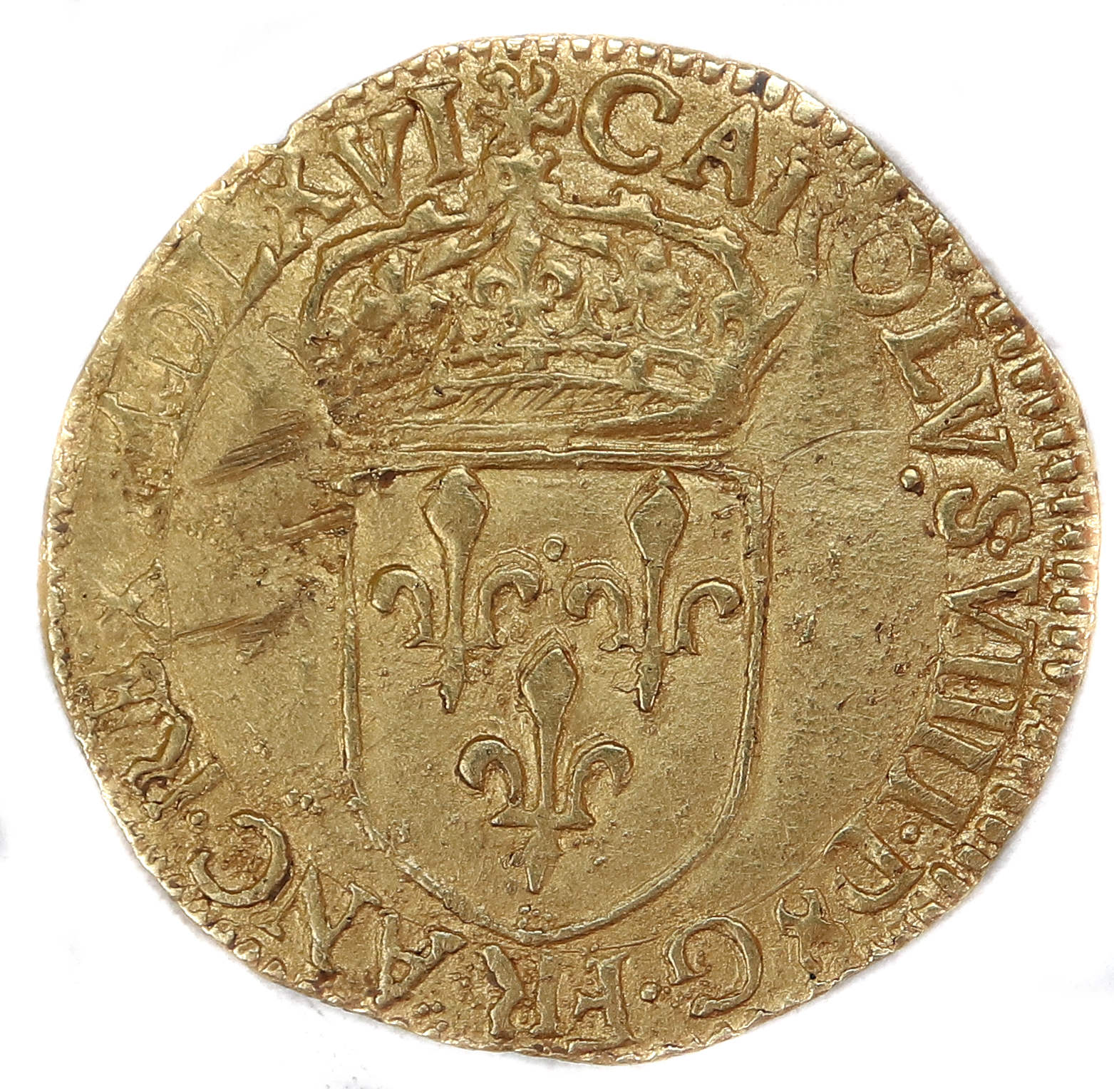(soleil)CAROLVS.VIIII.D(dif)G.FRANC.REX.M.D.LXVI Charles VIIII par la grâce de Dieu roi des Francs Ecu de France couronné