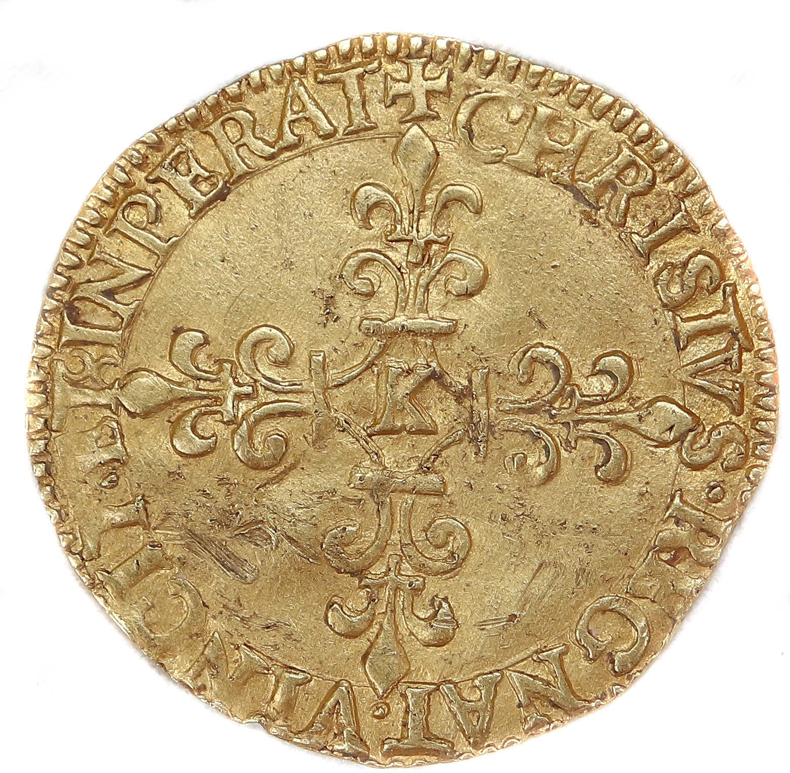 +CHRISTVS.REGNAT.VINCIT .ET.INPERAT Christ règne, vainc, commande Croix fleurdelisée avec lettre