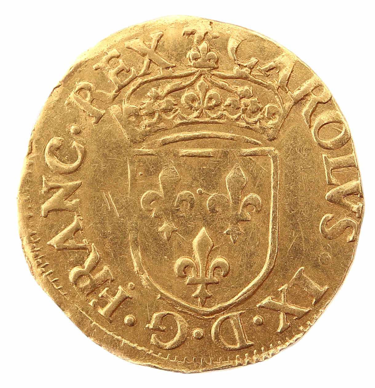 (soleil)CAROLVS.IX.D.G.FRANC.REX Charles VIIII par la grâce de Dieu roi des Francs Ecu de France couronné