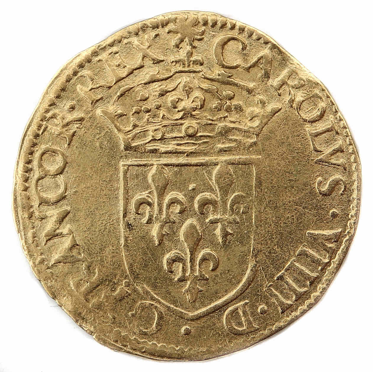 (soleil)CAROLVS.VIIII.D.G.FRANCOR.REX Charles VIIII par la grâce de Dieu roi des Francs Ecu de France couronné