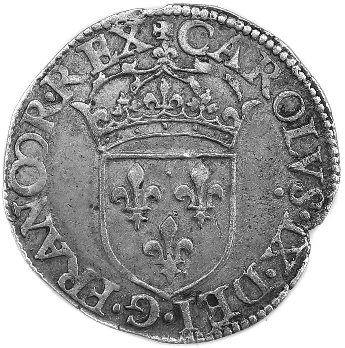 +CAROLVS.IX..DEI.G.FRANCOR.REX. Charles IX par la grâce de Dieu roi des Francs Ecu de France couronné.