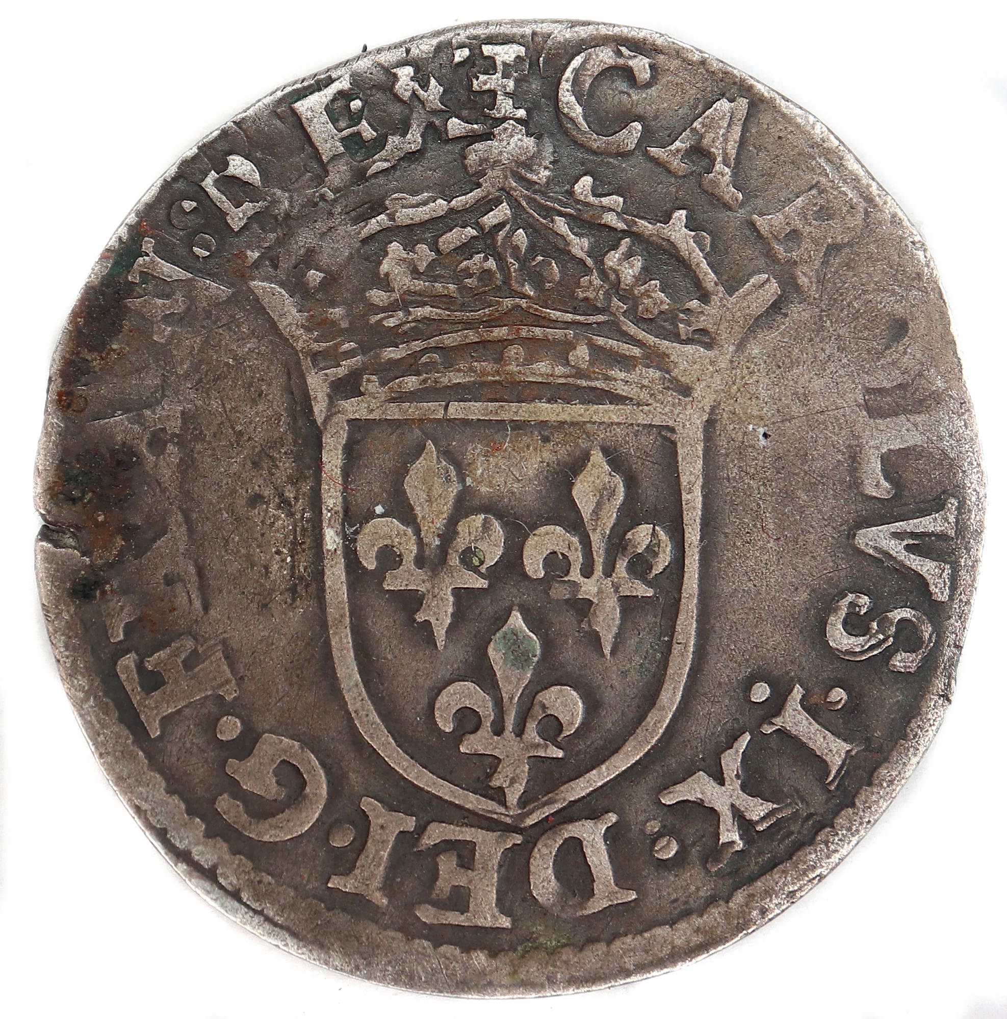 +CAROLVS.IX..DEI.G.FRAN.REX. Charles IX par la grâce de Dieu roi des Francs Ecu de France couronné.