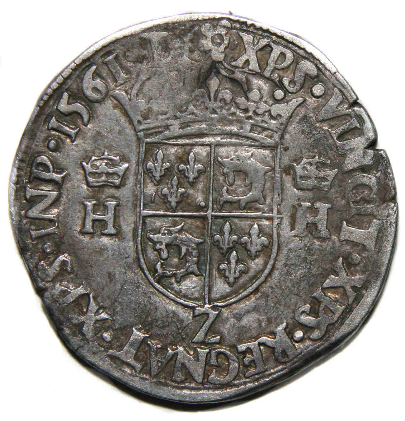 Lettre d'atelier : Z (au revers sous l'écu) Point secret : NON Millésime : 1561 Chiffre de frappe connu : 101 270 ex. (buste normal et buste large et 1/2 testons) |