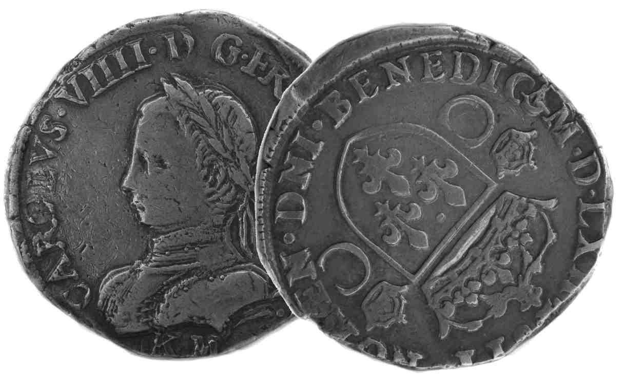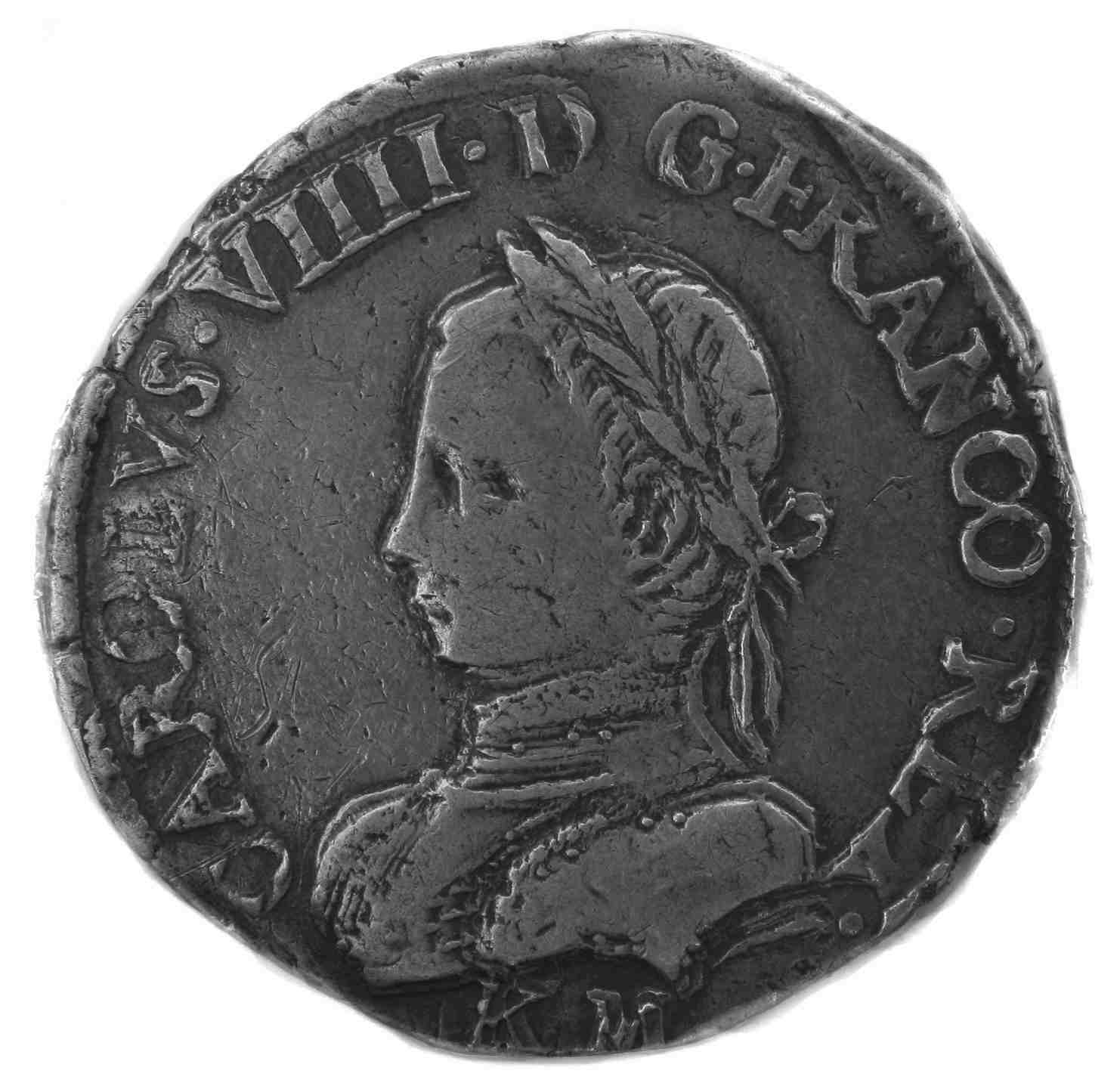 CAROLVS.VIIII.D.G.FRANCO.REX. K M Charles VIIII par la grâce de Dieu roi des Francs Buste du roi, à droite, cuirassé