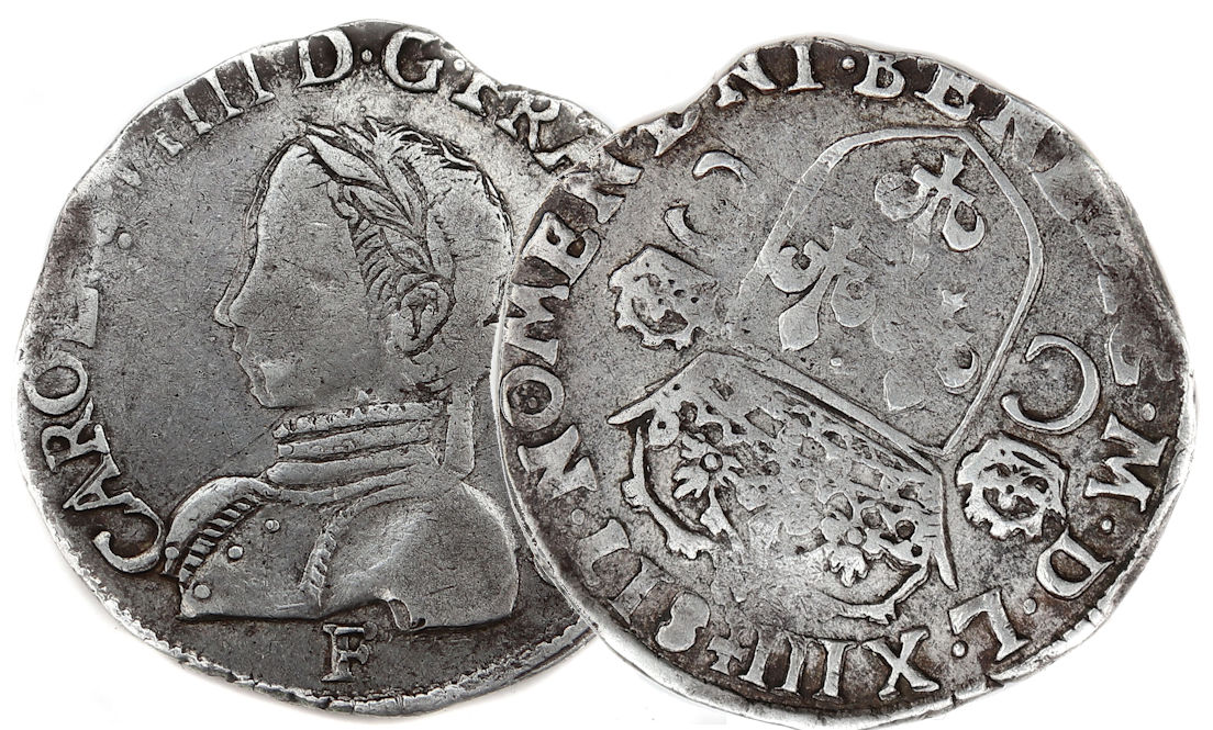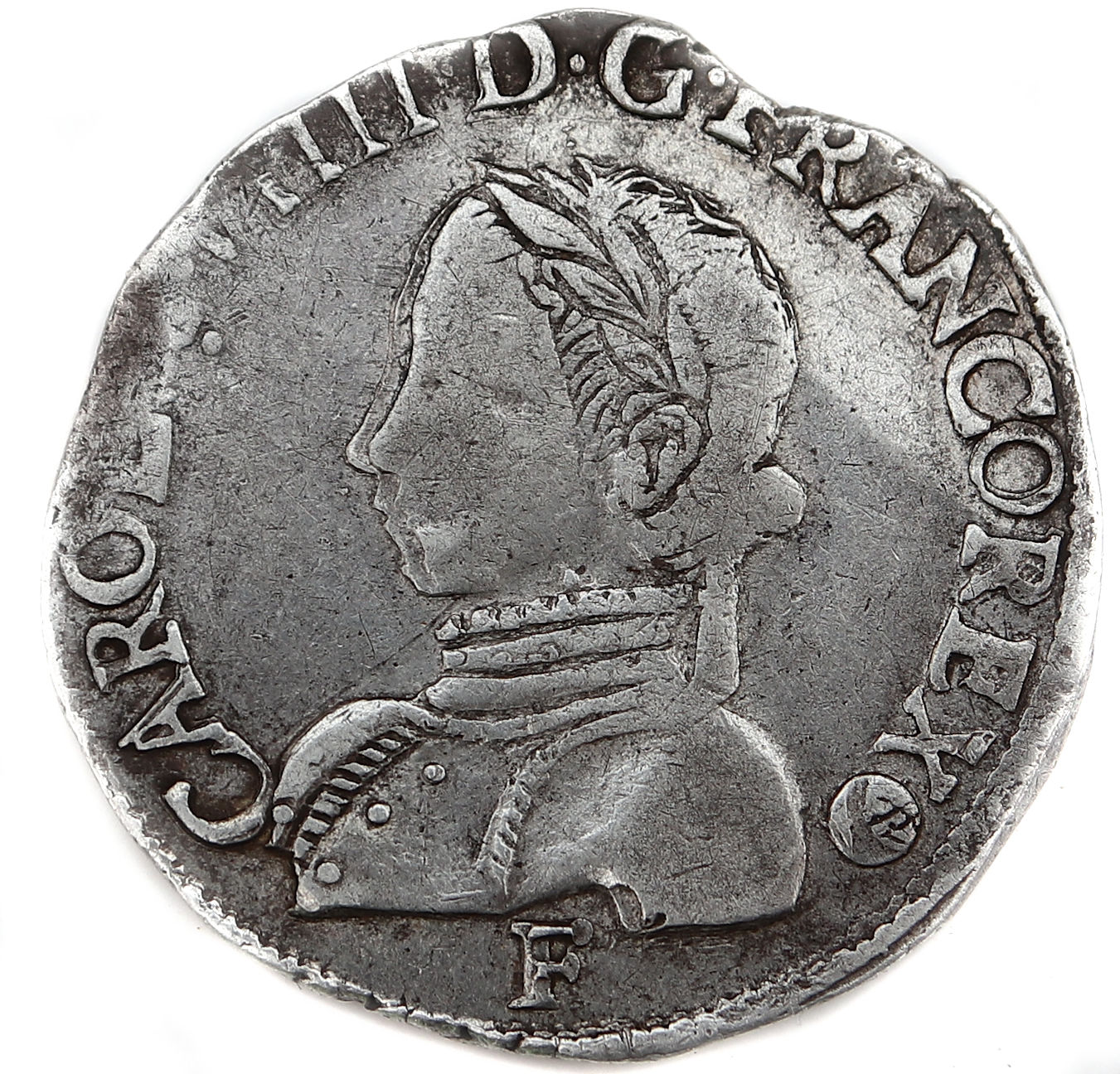 furent frappés à ANGERS de 1561 à 1569 puis de 1572 à 1575 Monnaie qui reste plaisante pour ce type. Comme souvent l'effigie présente une certaine usure et on note une faiblesse de frappe au niveau des légendes au droit et aurevers. Axe des coins : 7h. |