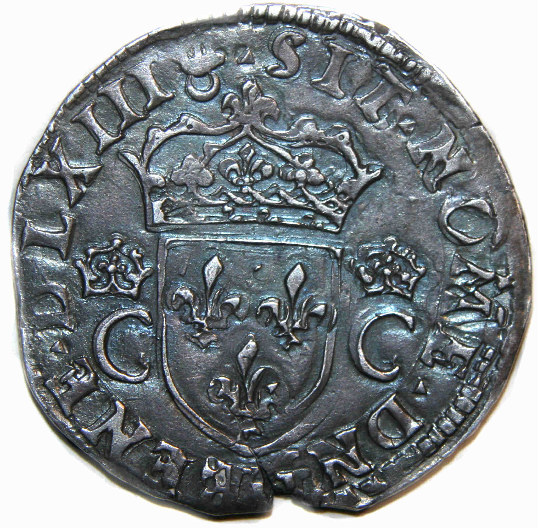 1575 en quantitté moindre. Variété intéréssante car sur la monnaie on note deux erreurs dans les légendes. Au droit, la titulature du roi : CAROLS VIIII. Au revers; il manque le M du millésime. Ces erreurs sont fréquentes sur les monnaies de l'atelier de Bordeaux. Ainsi lors de la vente de la collection Patrick DEVAUX en décembre 1999 (lot 80) un teston portait le simple millésime DLIII. La monnaie présente une patine sombre. A noter aussi un point entre la troisième et la quatrième lettre au droit. (Prov. : VSO 36 iNumis). Un exemplaire avec le même coin de droit a été présenté à la vente par CGB (vente àprix marqués FRANCE 26) |