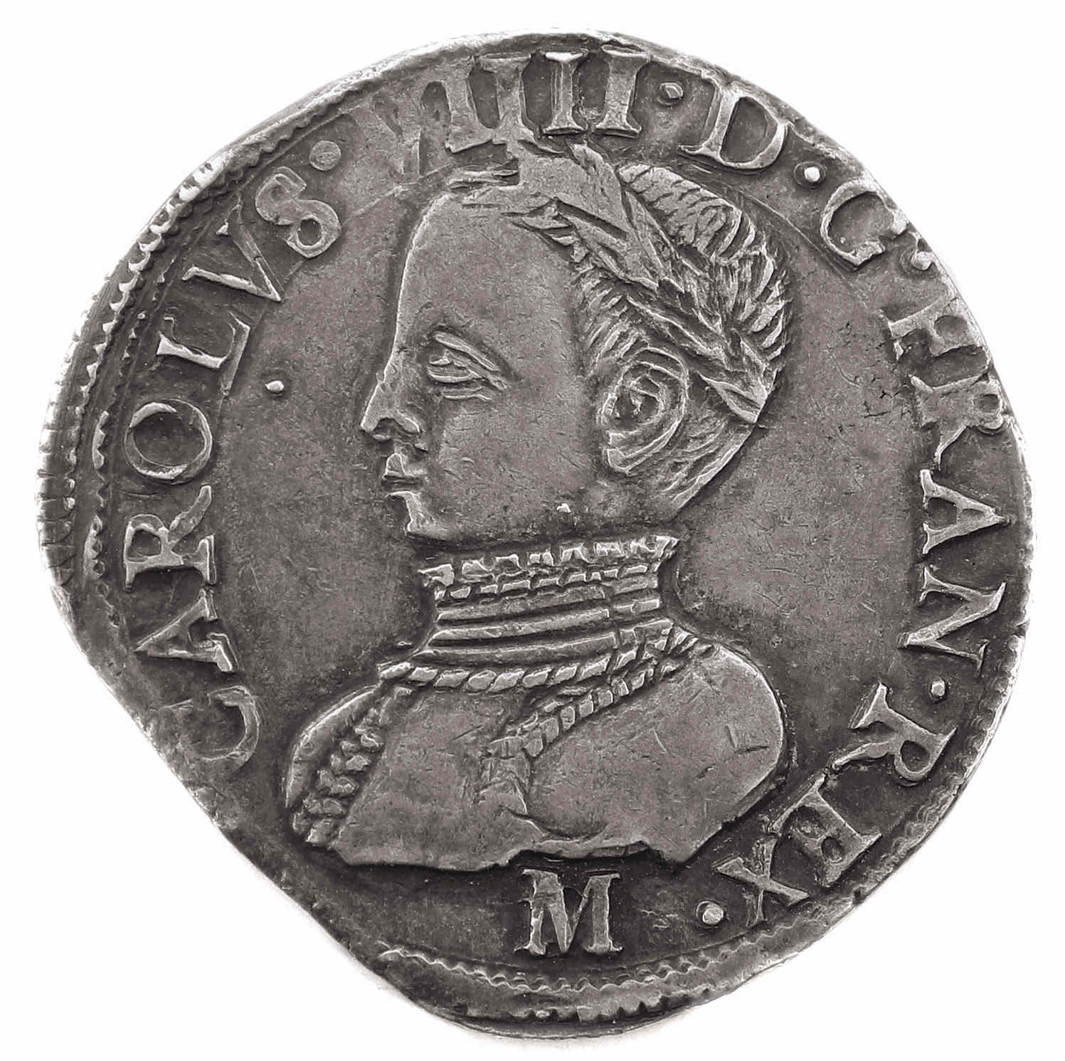 CAROLVS.VIIII.D.G.FRAN.REX. M Charles VIIII par la grâce de Dieu roi des Francs Buste du roi, à droite, cuirassé
