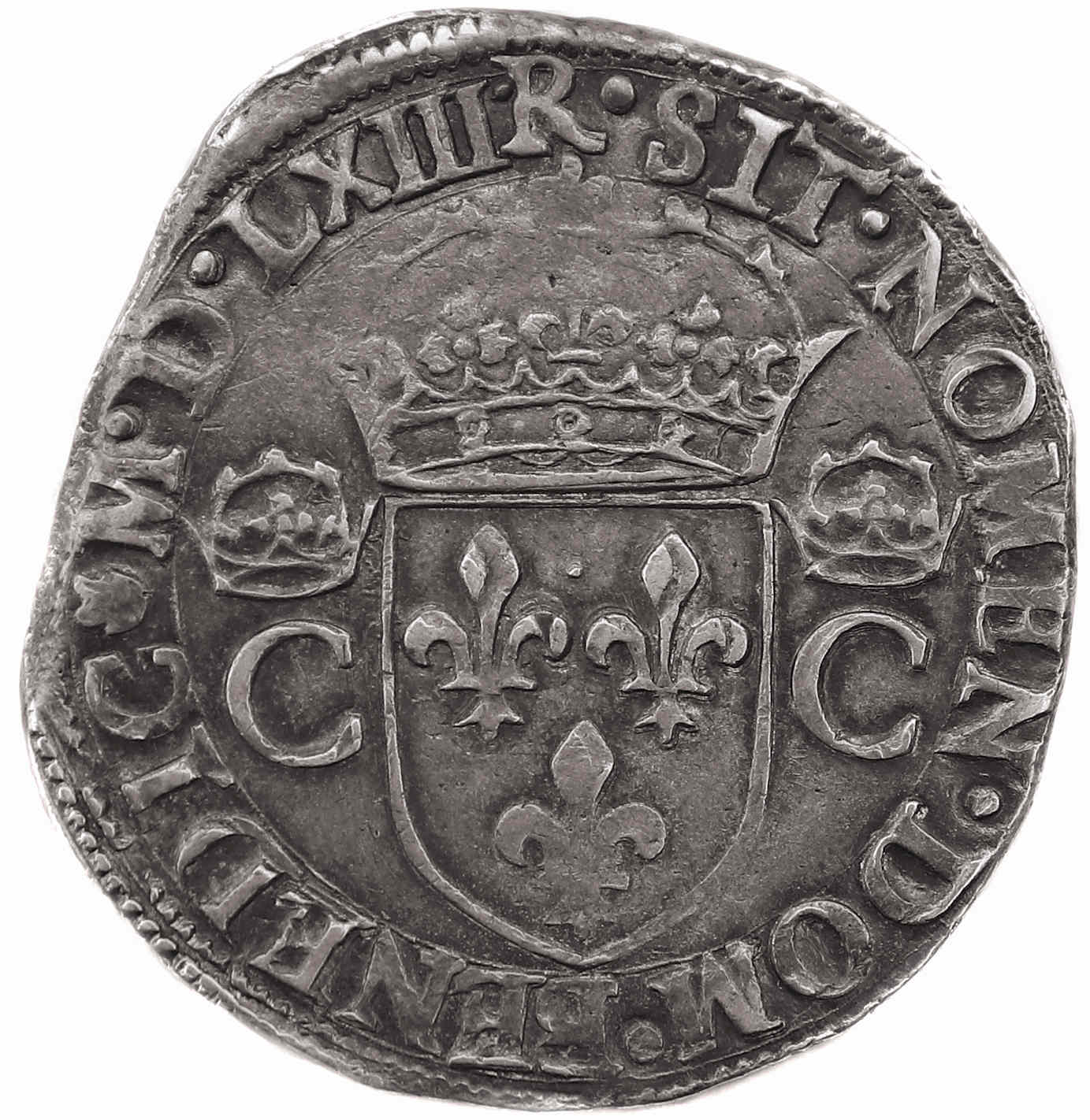 R.SIT.NOMEN.DOM.BENEDIC(dif).M.D.LXIII. Béni soit le nom du Seigneur Ecu de France couronné accosté