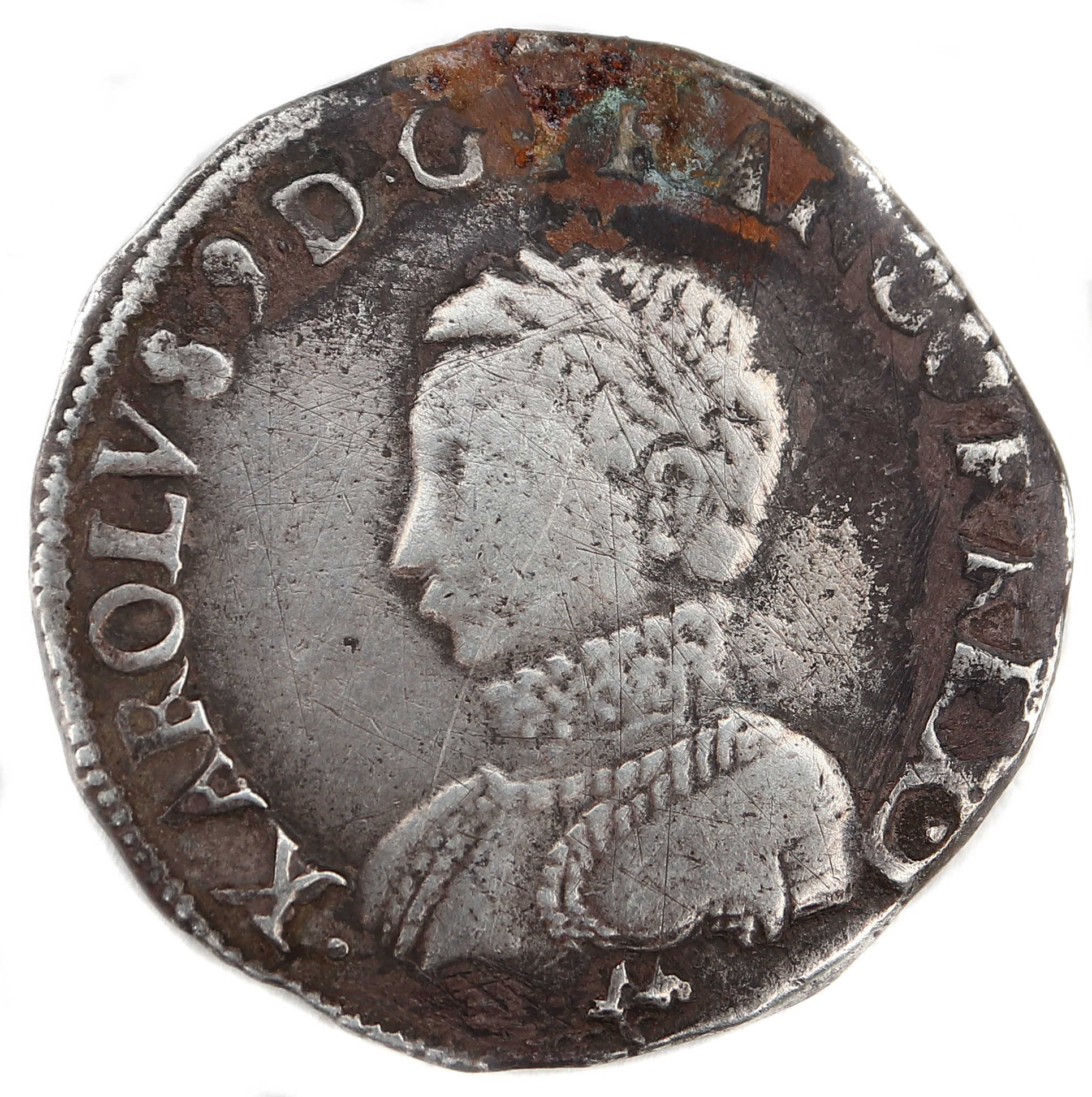 .KAROLVS.9..D.G.FRANCOR.REX. Buste du roi, à droite, cuirassé