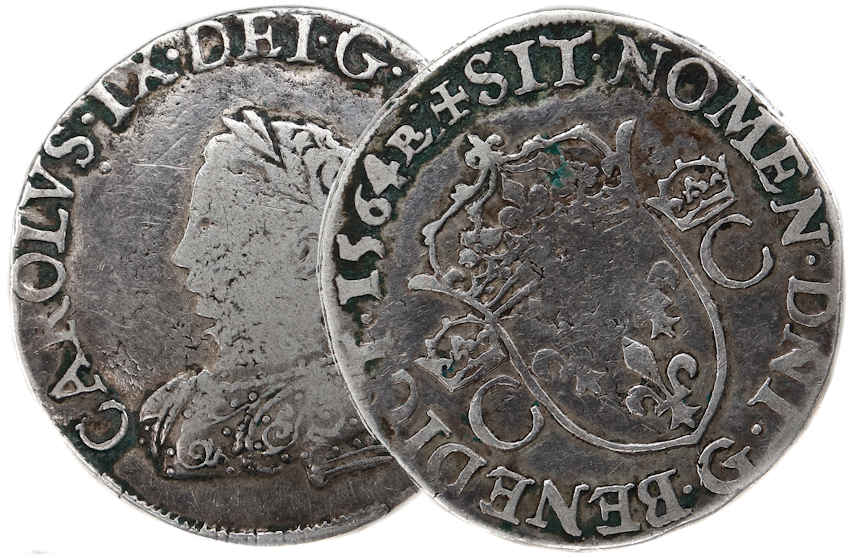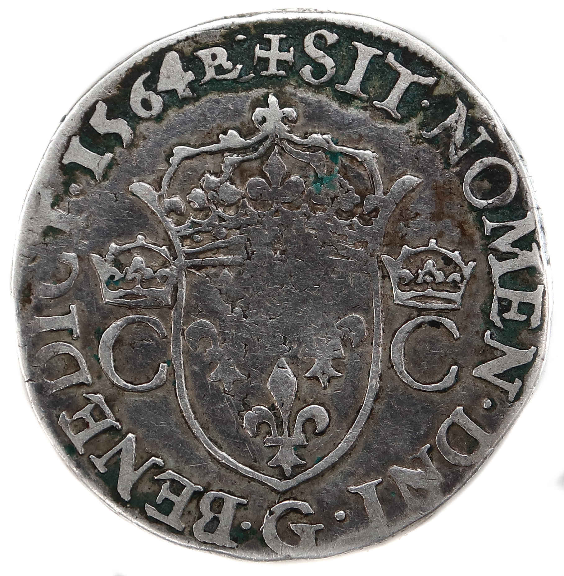 Lettre d'atelier : G (au revers sous l'écu) Point secret : 7éme (au droit) Millésime : 1564 Chiffre de frappe connu : 17 216 ex. (avec 1/2 testons) Indice de rareté : R5 |