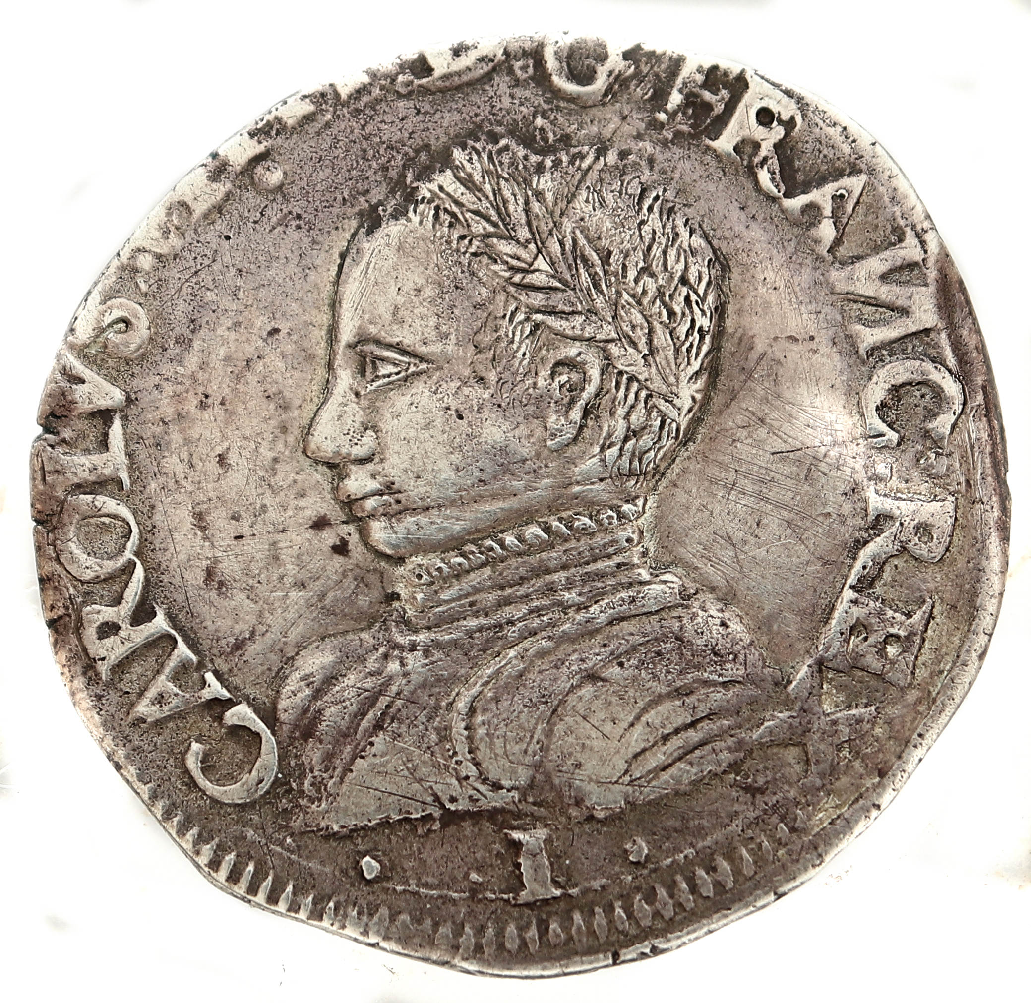 rétrogrades. Sur certaines monnaies la titulature apparait sous la forme CAROLVS IX Le flane est court et irrgulier, probablement rogné. Le poids est particuliérement léger. Le revers est très beau. Au droit le portrait du roi a peut être été regravé légérement. Provenance : bourse de TAVERNY 2024 . Axe des coins : 7 h |