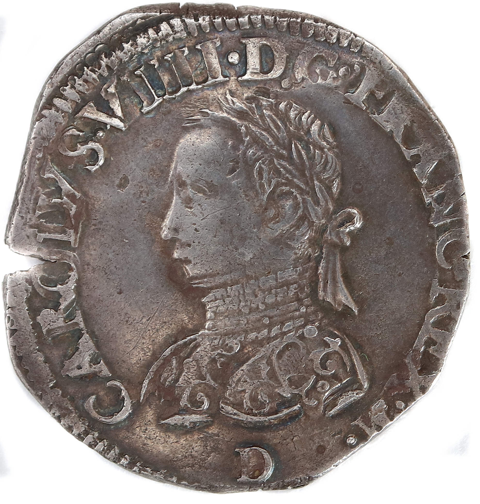 CAROLVS.VIIII.D.G.FRANC.REX.(dif). D Charles VIIII par la grâce de Dieu roi des Francs Buste du roi, à droite, cuirassé