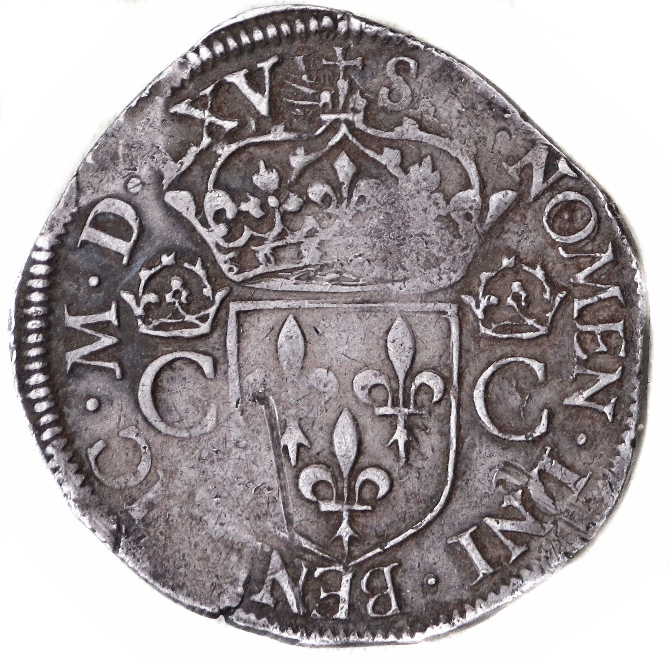 d'autres avec le différent de Mathurin TURPIN (deux fers de lance). Le poids est un peu léger pour cette monnaie frappée sur un flan irrégulier. La frappe est assez nette malgré quelques petites faiblesses. Le millésime est très difficile à lire mais parait bien être MDLXVI, le dernier chiffre chevauchant par ailleurs apparemment une sphère , différent de Philippe Varice. Monnaie qui reste plaisante pour ce type. Axe des coins : 11 h. |
