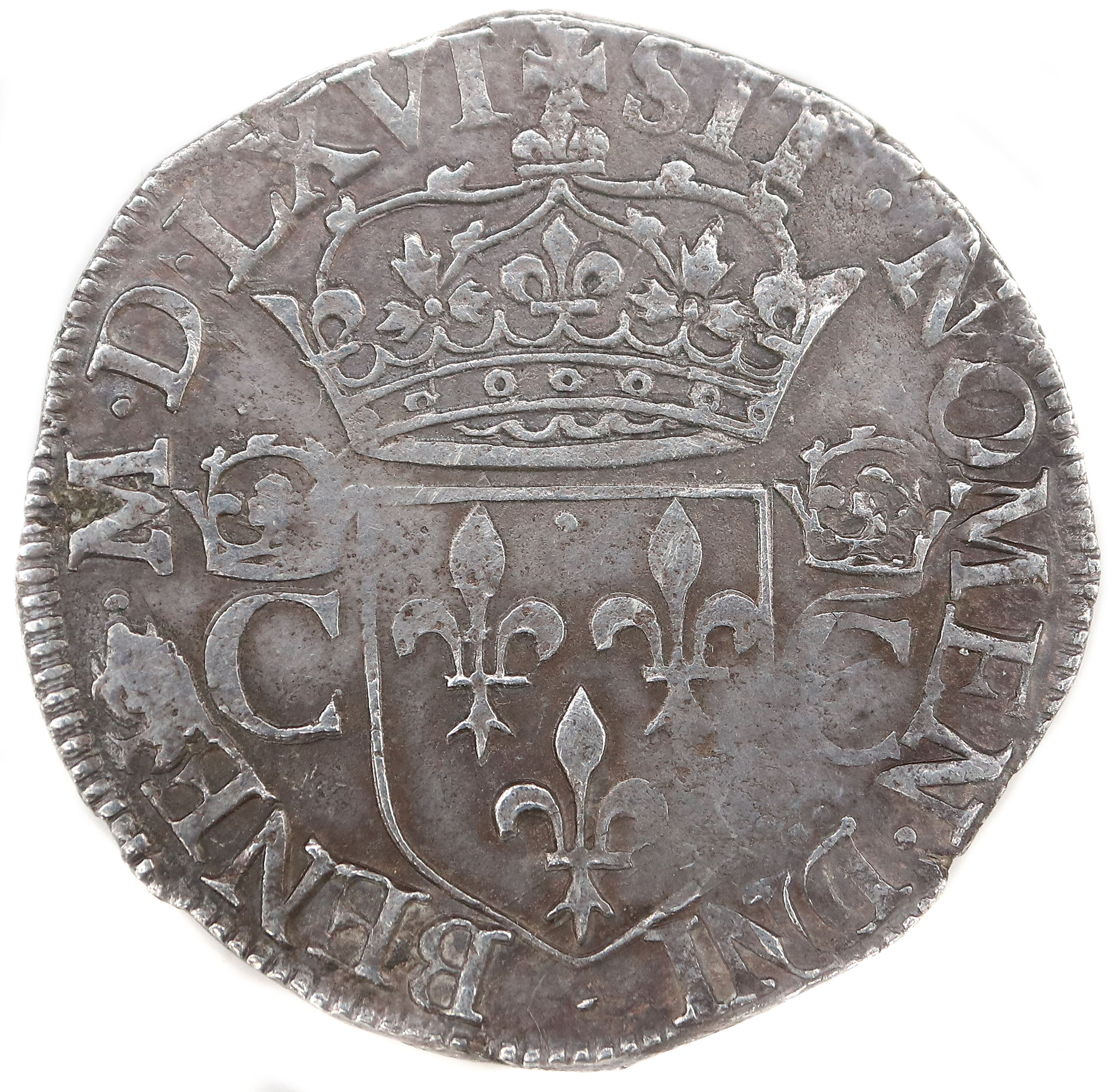 damasquinée Trés bel exemplaire pour ce type où l'effigie du roi est souvent assez usée. La frappe est bien centrée. Un défaut au niveau du différent du maître d'atelier ne permet pas d'attribuer la monnaie à l'un des deux maîtres quise sont succédés à LA ROCHELLE en 1566. A noter la lettre d'atelier sous le buste alors que sur beaucoup de testons on la trouve au revers à la pointe de l'écu. Axe des coins : 1 h |