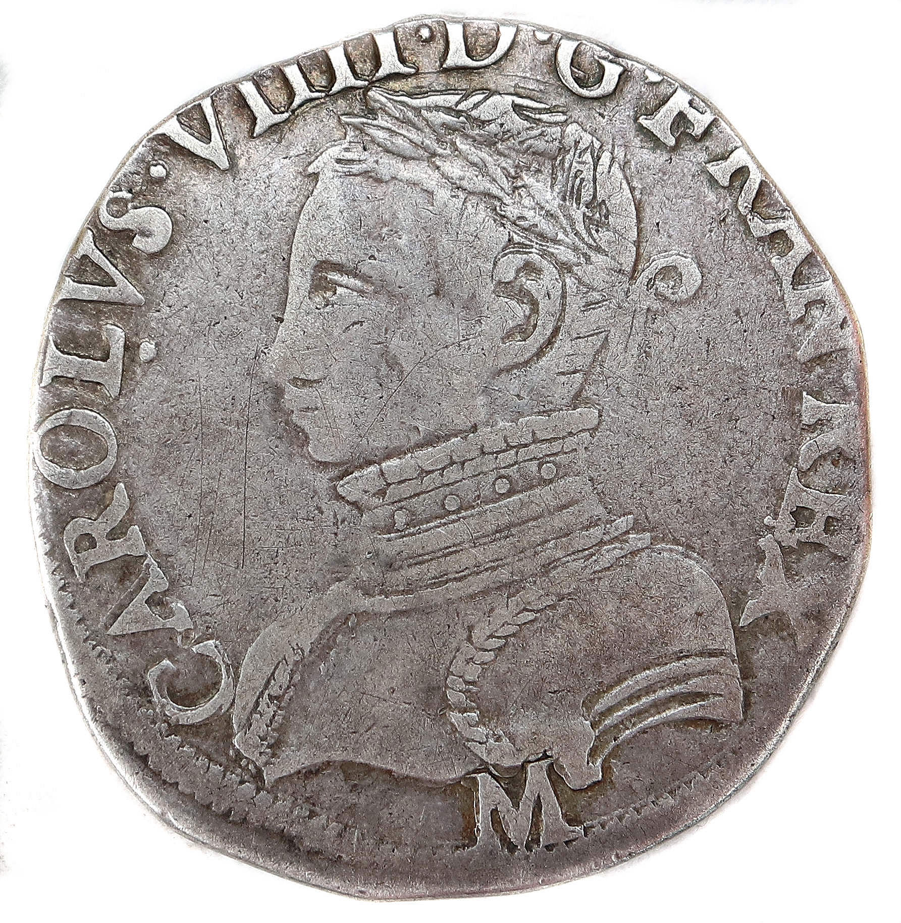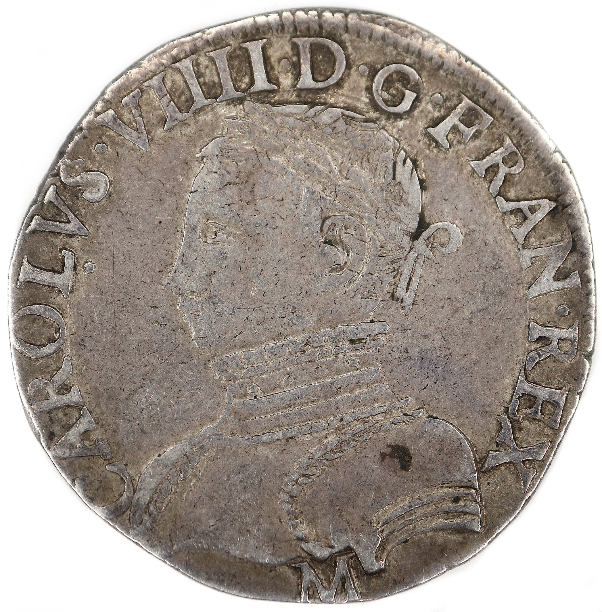 CAROLVS.VIIII.D.G.FRAN.REX. M Charles VIIII par la grâce de Dieu roi des Francs Buste du roi, à droite, cuirassé et tête nue