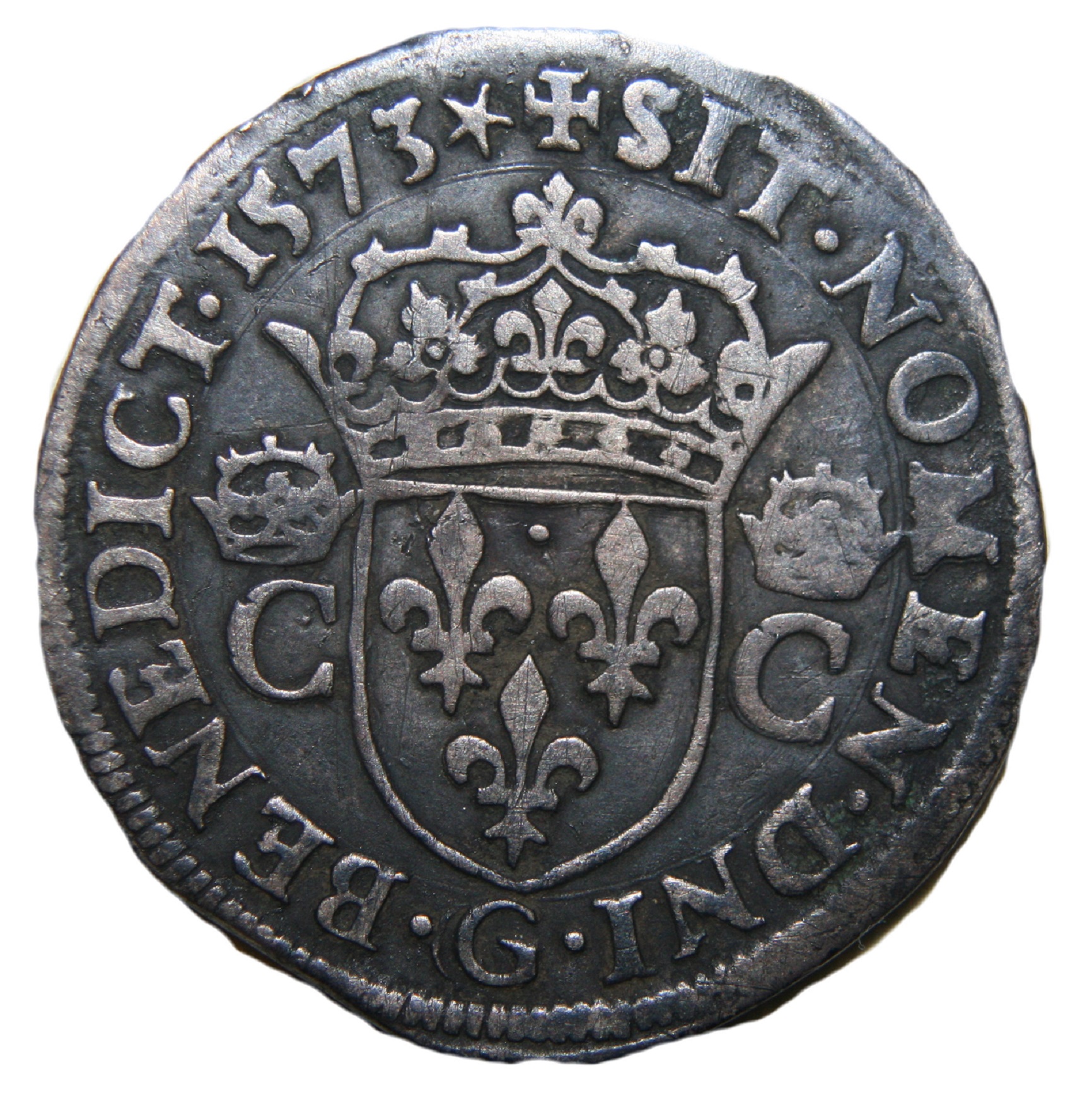 +SIT.NOMEN.DNI.G.BENEDICT.1573 .Etoile Que le nom du Seigneur soit béni Ecu de France couronné accosté de 2 C couronnées