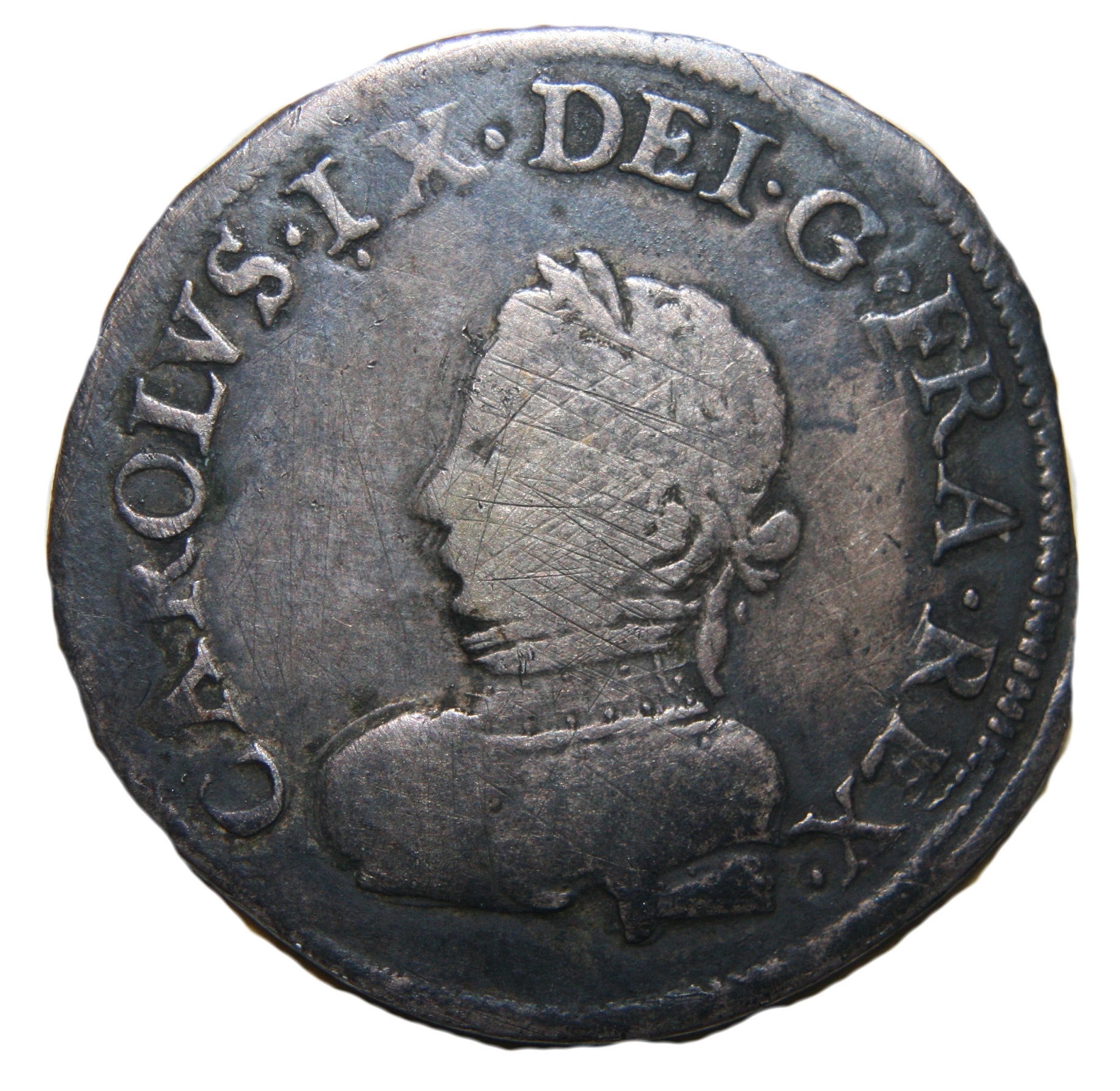 .CAROLVS.IX..DEI.G.FRA.REX. Buste du roi, à gauche, cuirassé