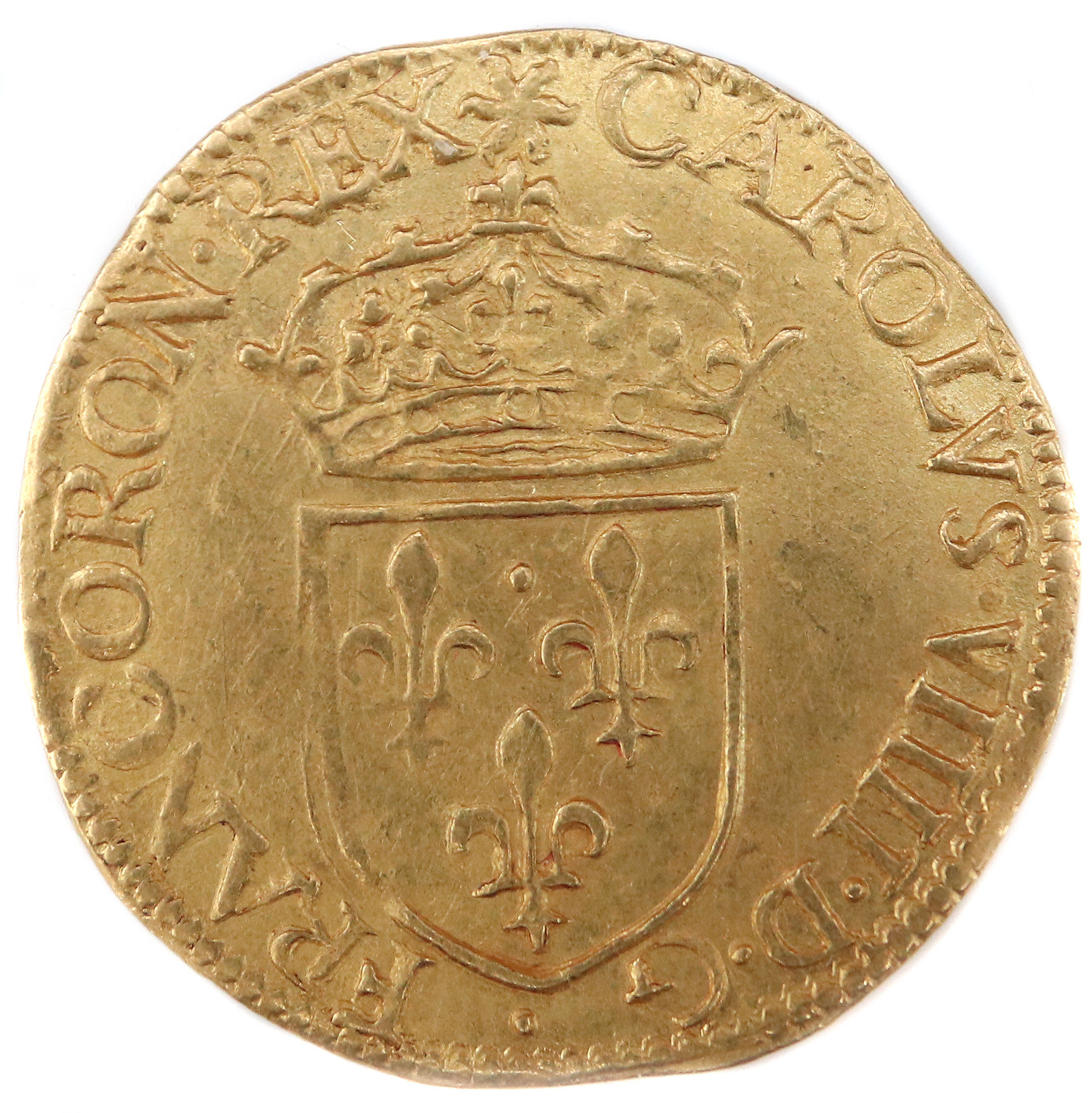 CAROLVS.VIIII.D.G.FRANCORON.REX Charles VIIII par la grâce de Dieu roi des Francs Ecu de France couronné d'un