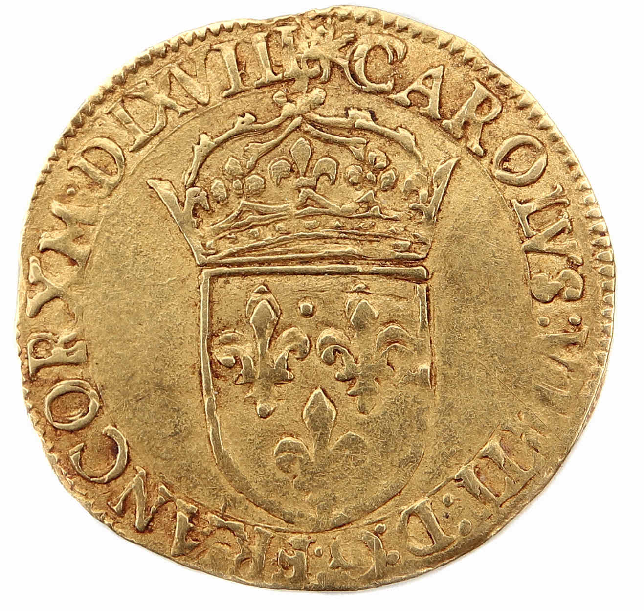CAROLVS:VIIII:D:G:FRANCO.RX.M.D.LVIII Charles VIIII par la grâce de Dieu roi des Francs Ecu de France couronné d'un