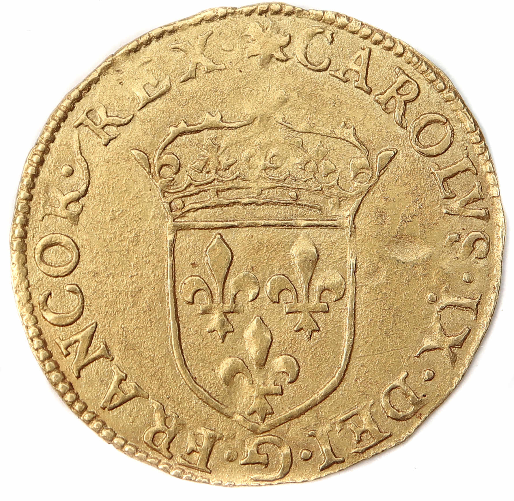 (soleil)CAROLVS.IX.DEI.G:FRANCOR.REX Charles IX par la grâce de Dieu roi des Francs Ecu