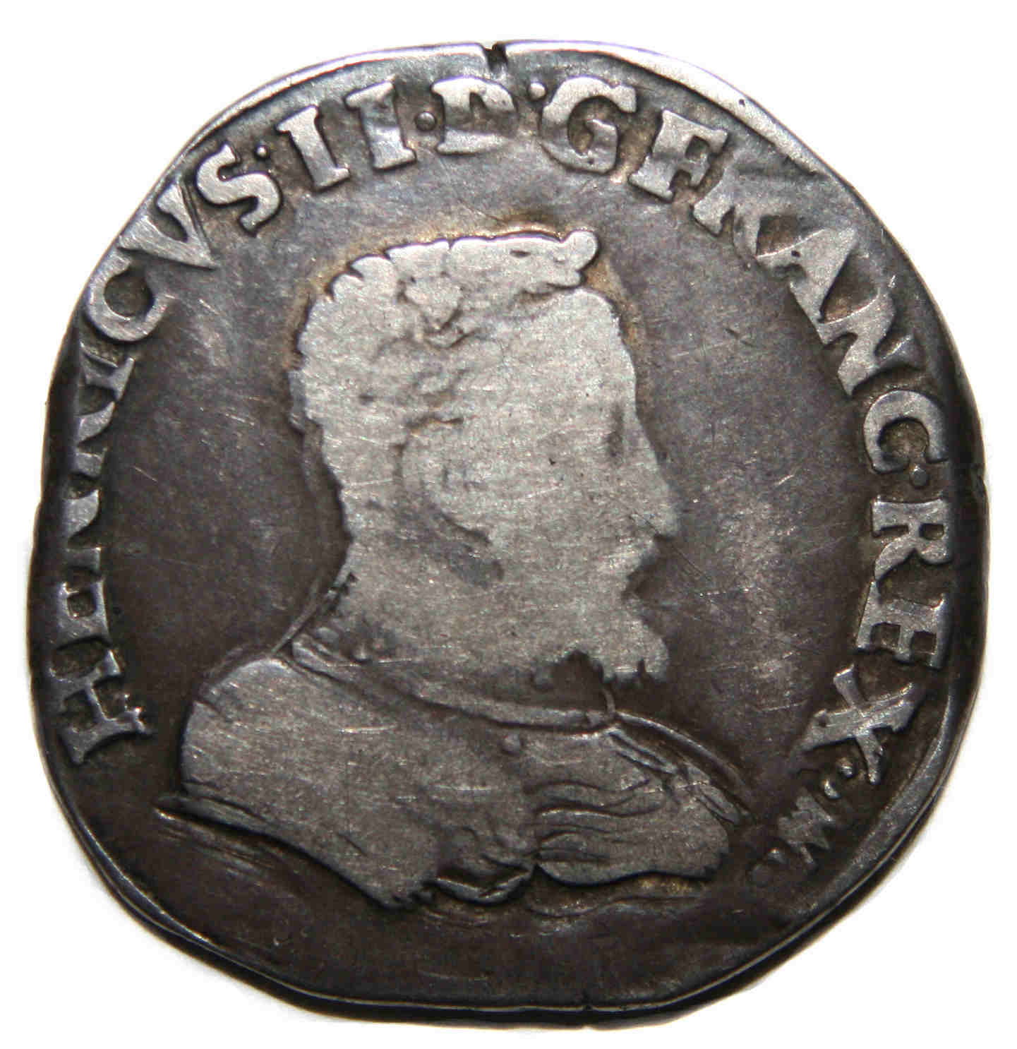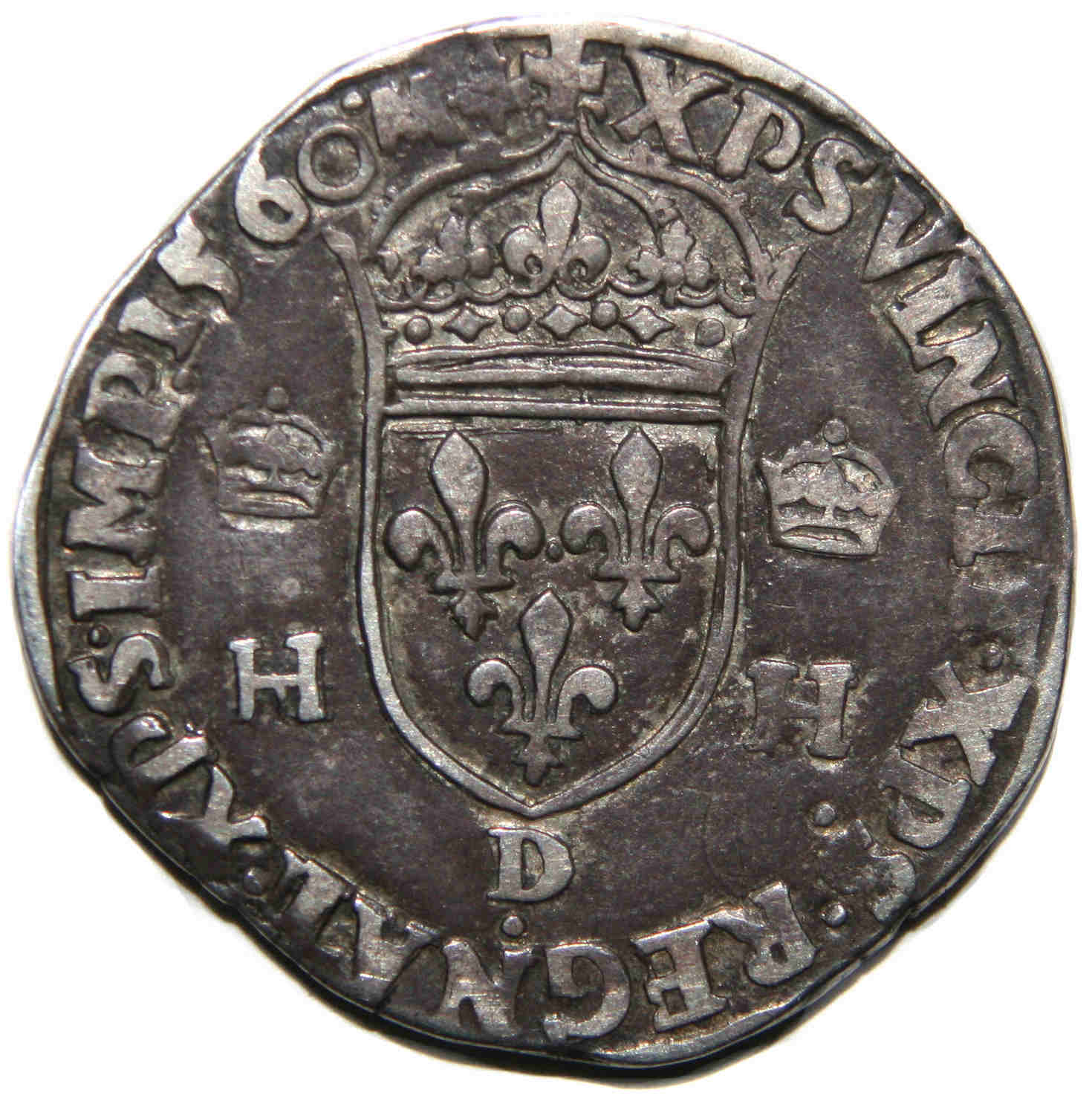 pour CHARLES IX. L'effigie du roi est assez usée. La monnaie présente une patine foncée. |