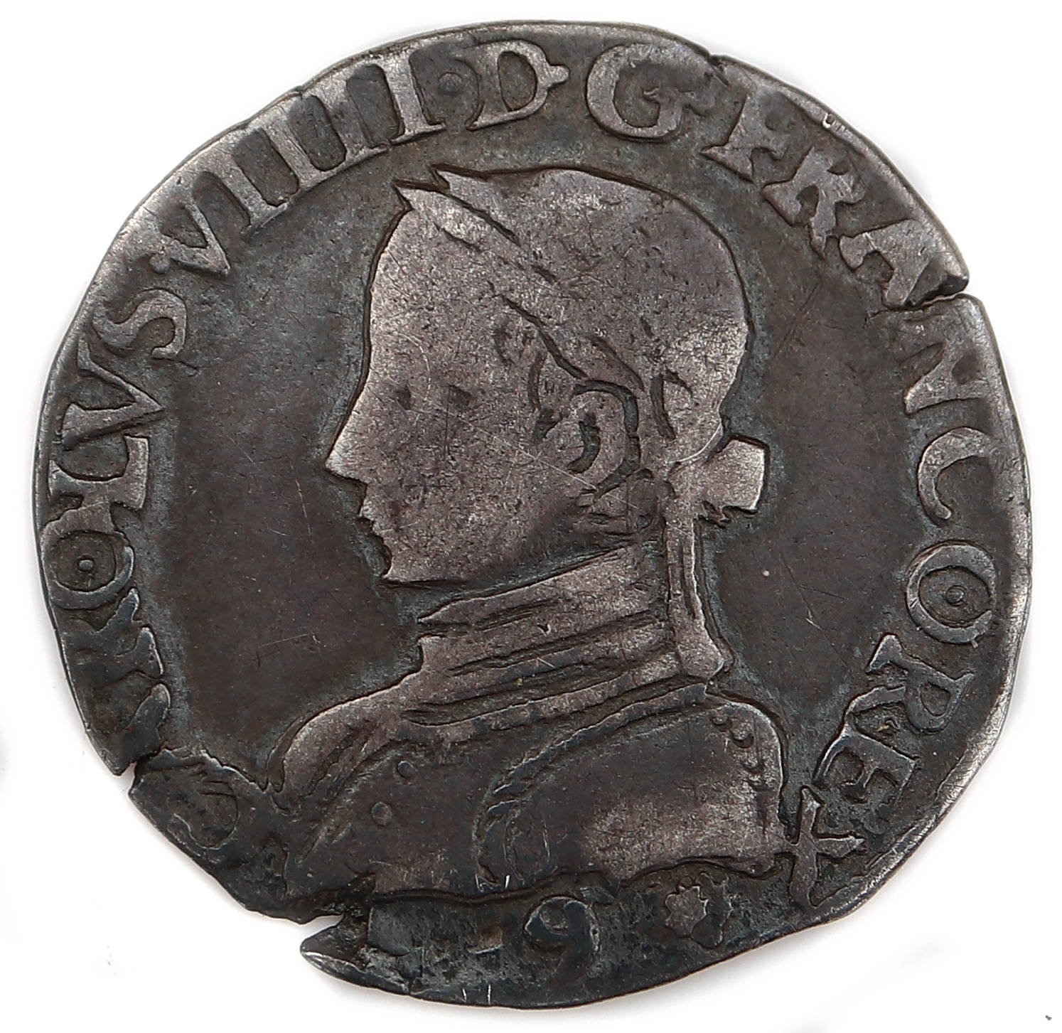 .CAROLVS.VIIII.D.G.FRANCO.REX. 9 Charles IX par la grâce de Dieu roi des Francs Buste du roi, à gauche, cuirassé