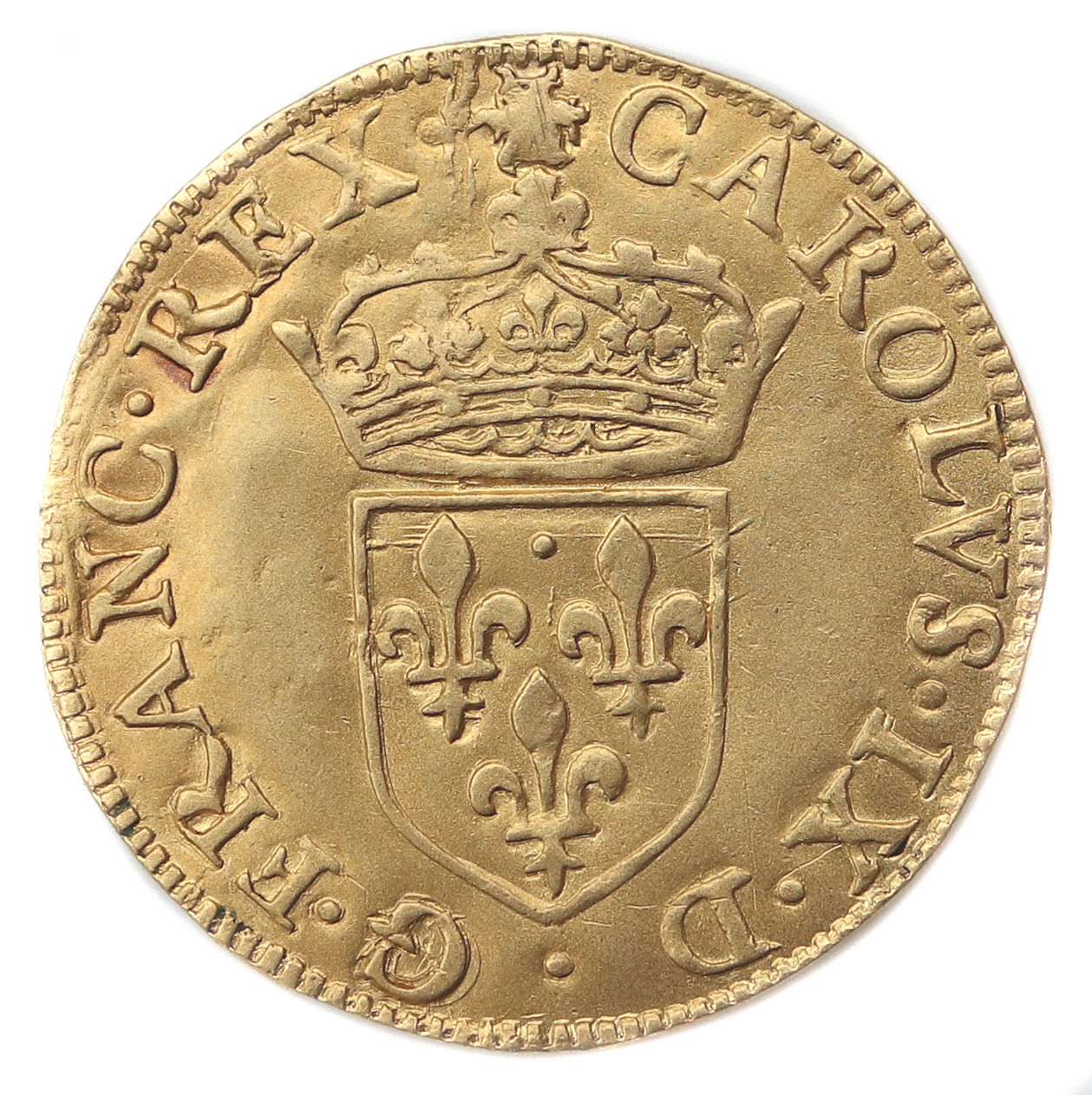 (soleil)CAROLVS.IX.D.G.FRANC.REX. Charles VIIII par la grâce de Dieu roi des Francs Ecu de France couronné