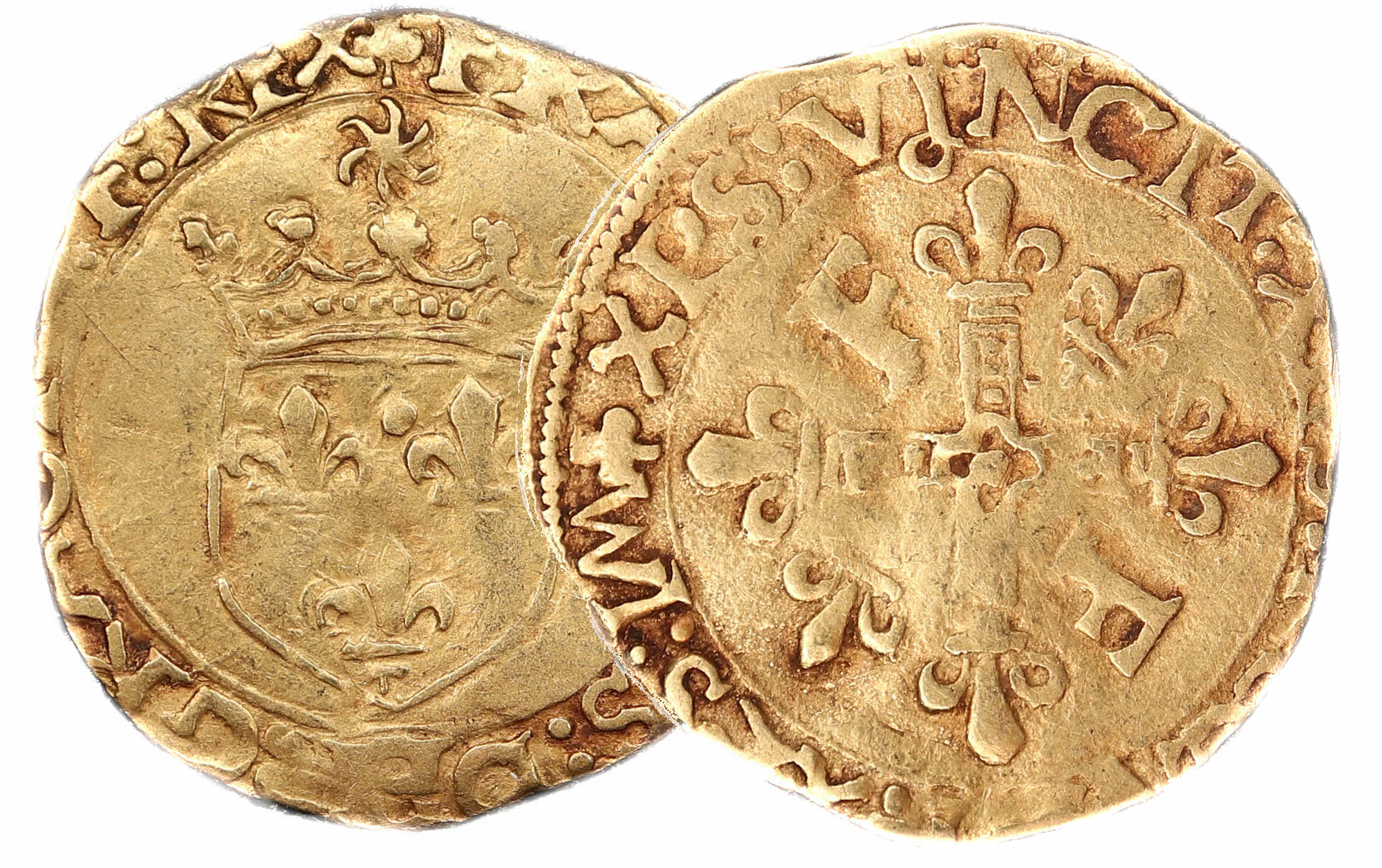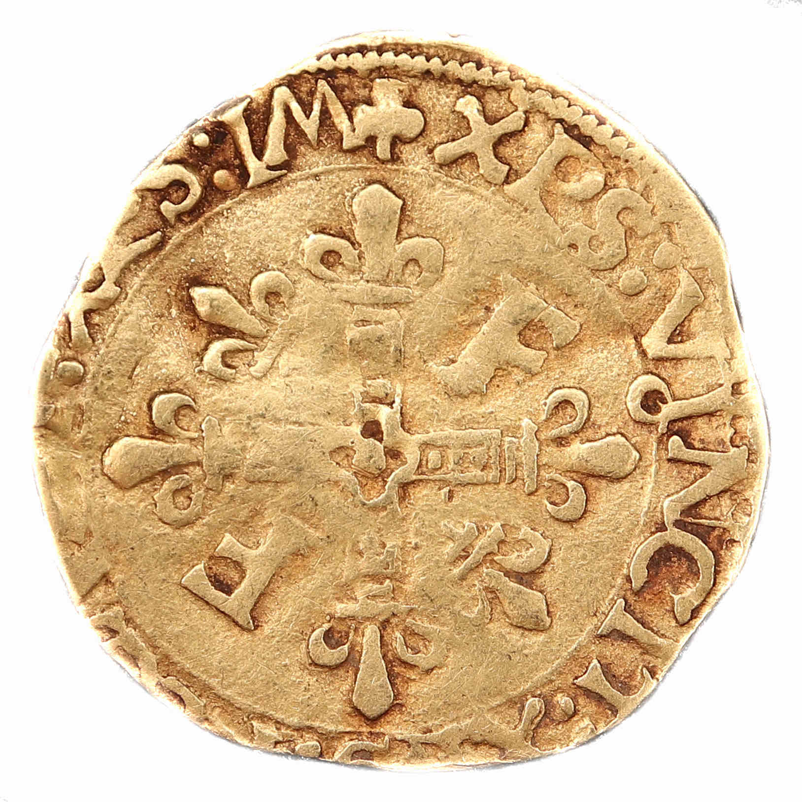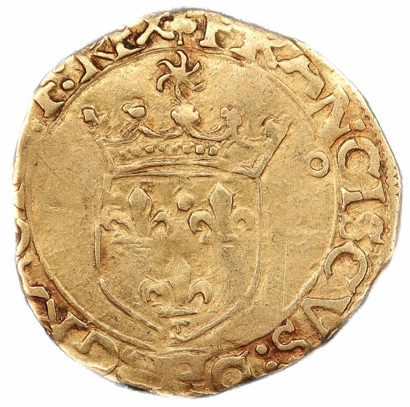 à propos de ce type monétaire : Les écu d'or au soleil à ce type (5éme, troisième émission) furent frappés suite à l'ordonnance du 21 juillet 1519. Ils se distinguent au droit par un écu non accosté et au revers par une croix cantonnée de 2 F et de 2 fleurs de lys. Le flan est un peu court, probablement rogné. Cela a pour effet de mettre hors flan une partie des légendes mais tous les éléments de la monnaie restent identifiables. Si l'écu n'est pas une monnaie rare, le demi écu est beaucoup plus difficile à trouver. Axe des coins : 9 h. |