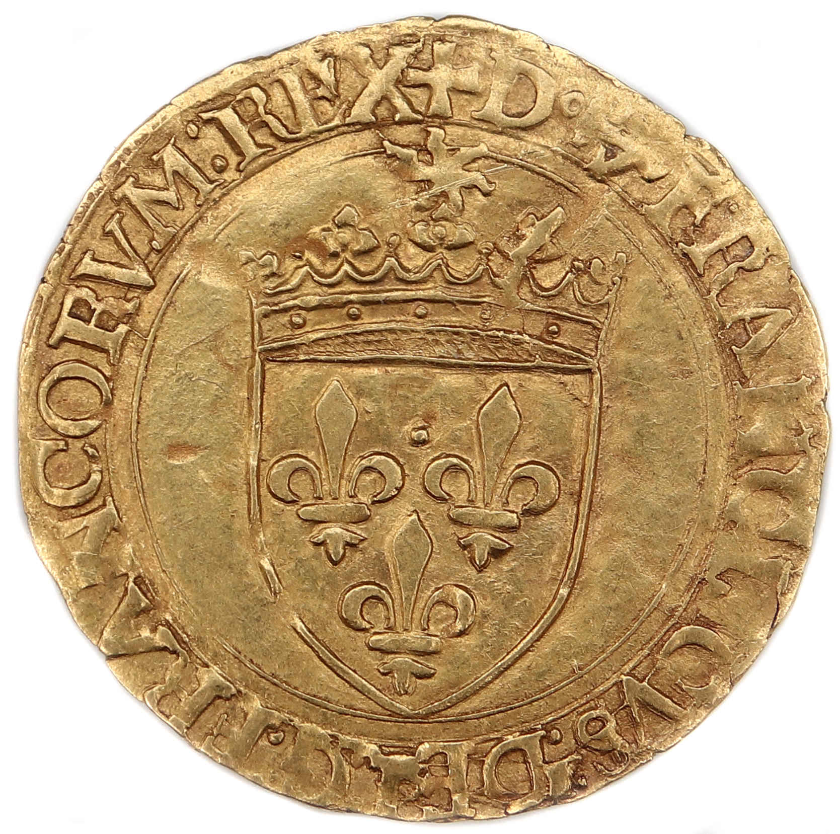 à propos de ce type monétaire : Les écus d'or au soleil à ce type (5éme) furent frappés suite à l'ordonnance du 21 juillet 1519. Trés belle qualité pour cette monnaie à la frappe bien centrée qui présente à peine quelques faiblesses de frappe au niveau des légendes.. |
