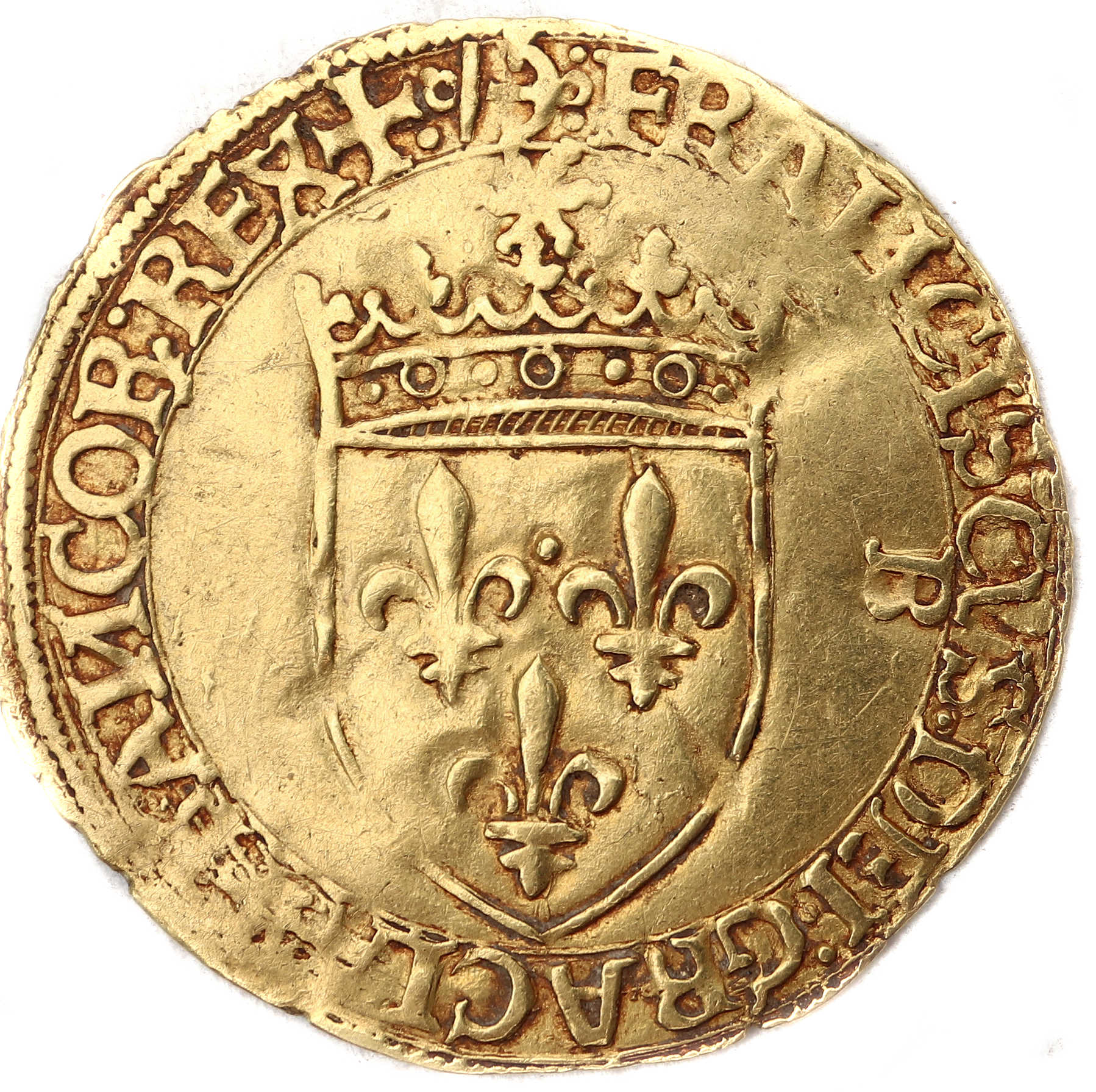 à propos de ce type monétaire : Les écus d'or au soleil à ce type (5éme) furent frappés suite à l'ordonnance du 21 juillet 1519. La monnaie est assez agréable. La frappe est légérement décalée tant au droit qu'au revers. Les différents N des légendes sont rétrogrades. Il faut remarquer le positionnement assez inhabituel du différent du Maître d'Atelier. Habituellement ce dernier se trouve dans la légende, sur la monnaie le différent se trouve au droit sous la neuvième lettre et au revers sous la 4éme lettre. Provenance : Bourse deDainville 2023. Axe des coins : 3 h |