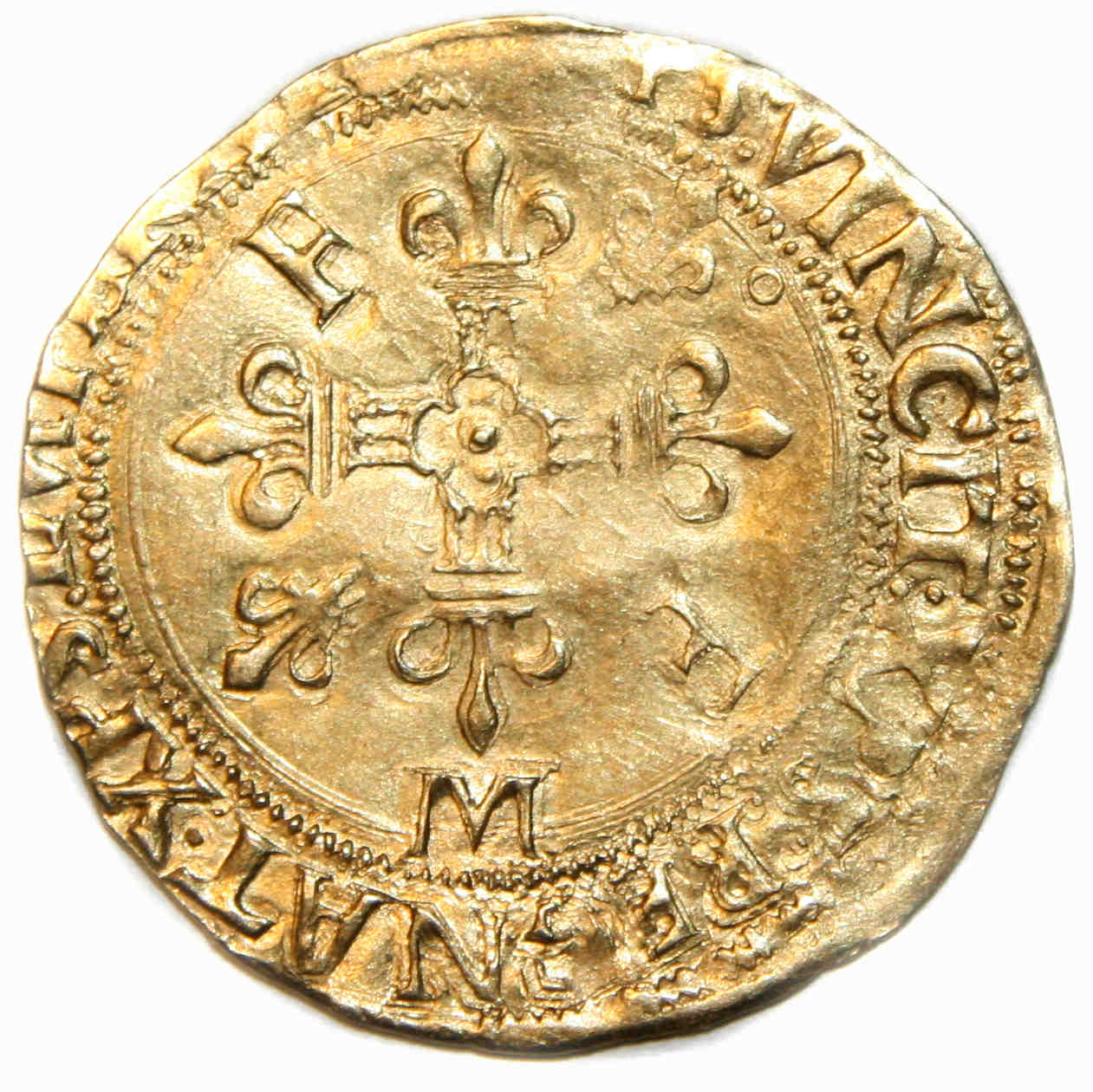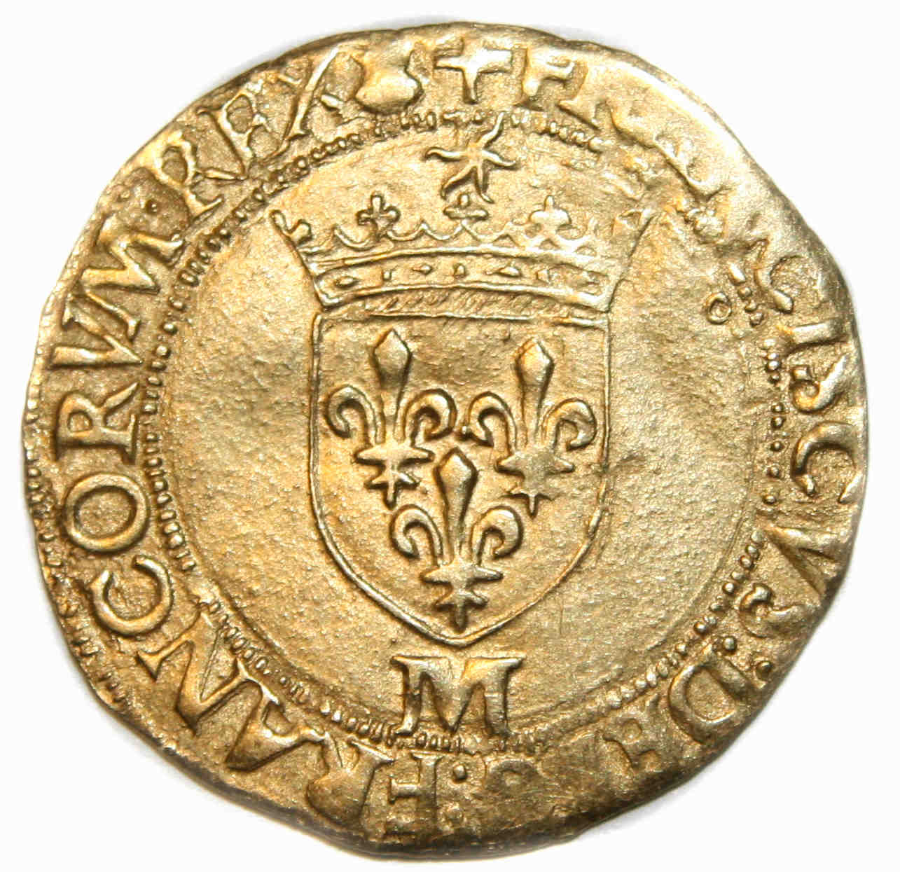 à propos de ce type monétaire : Les écu d'or au soleil à ce type (12éme) furent frappés suite à l'ordonnance du 14 janvier 1540 La monnaie est assez belle au droit mais le revers présente une frappe un peu molle et décalée qui avec le flan un peu court empêche la lecture d'une partie de la légende |
